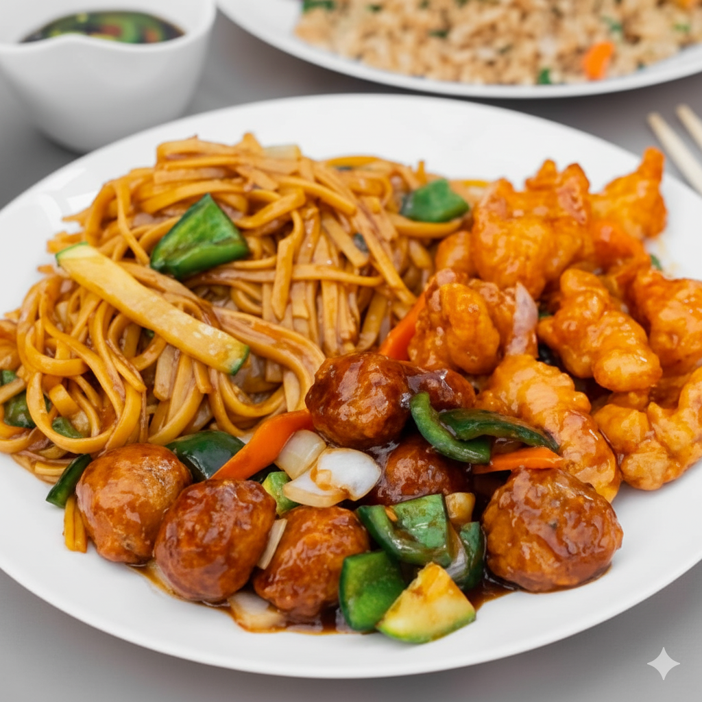 1 Guarnición (250gr) + 1 Guisado a Escoger (200 gr) + Vegetales al Wok (250 gr) + Galleta de la Suerte