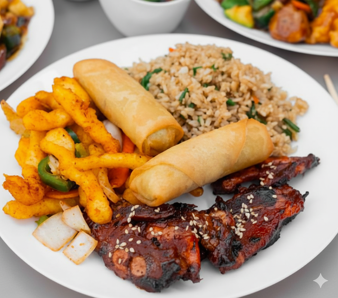 3 Guisados a Escoger (200 gr cada uno) + 3 Guarniciones a Escoger (250 gr cada una) + 3 Rollos Primavera + 3 Galletas de la Suerte