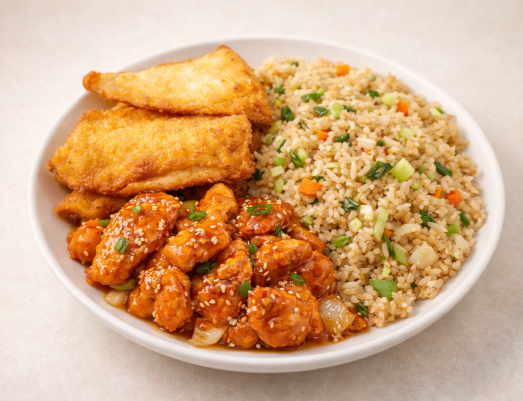 1 Guarnición (250 g) más 1 guisado a escoger (200 g) más vegetales al wok (250 g) más galleta de la suerte.