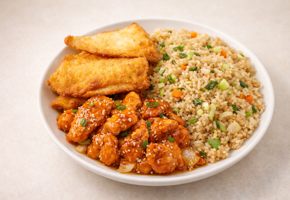 1 Guarnición (250gr) + 1 Guisado a Escoger (200 gr) + Vegetales al Wok (250 gr) + Galleta de la Suerte