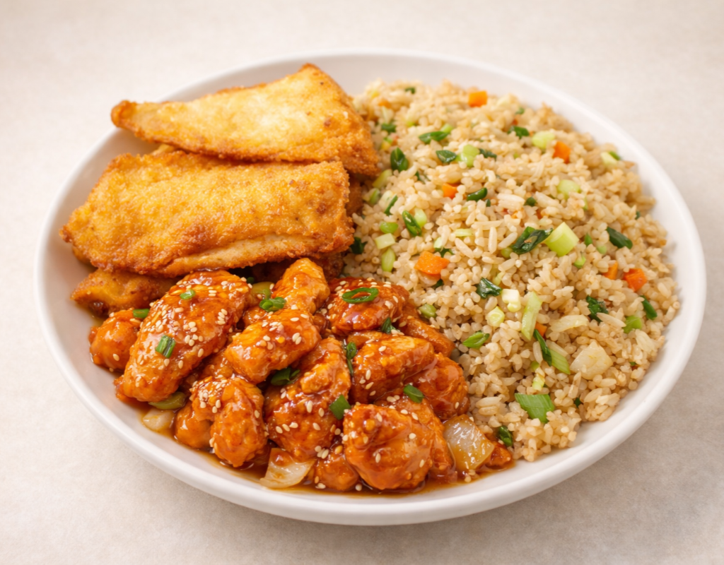 1 Guarnición (250gr) + 1 Guisado a Escoger (200 gr) + Vegetales al Wok (250 gr) + Galleta de la Suerte