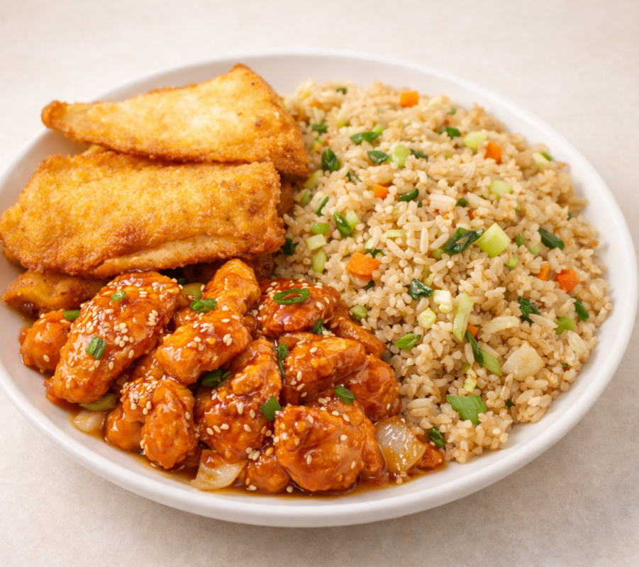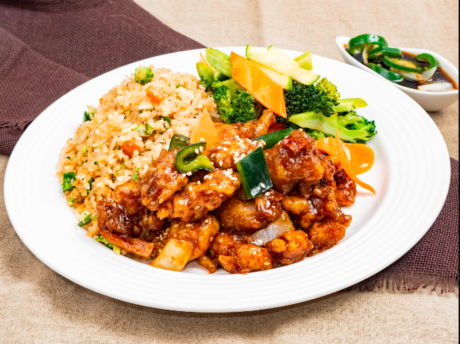 1 Guarnición (250 g) más 1 guisado a escoger (200 g) más vegetales al wok (250 g) más galleta de la suerte.
