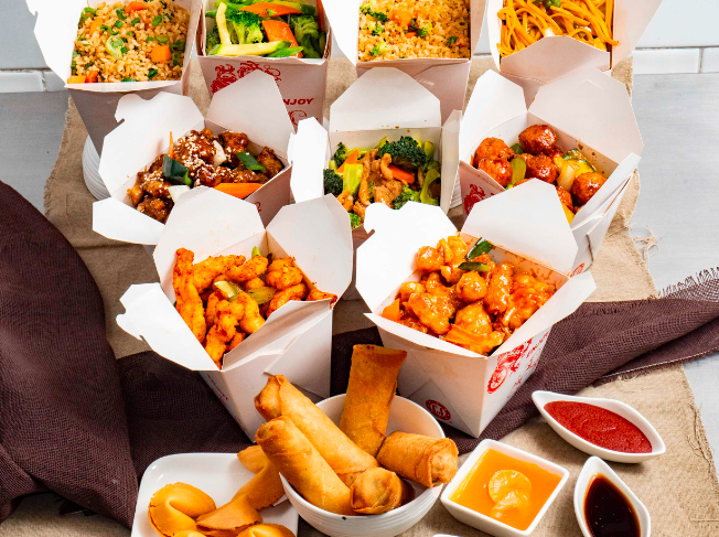 4 Guisados (200 g cada uno) más 4 guarniciones (250 g cada una) más 4 rollos primavera más 4 galletas de la suerte.