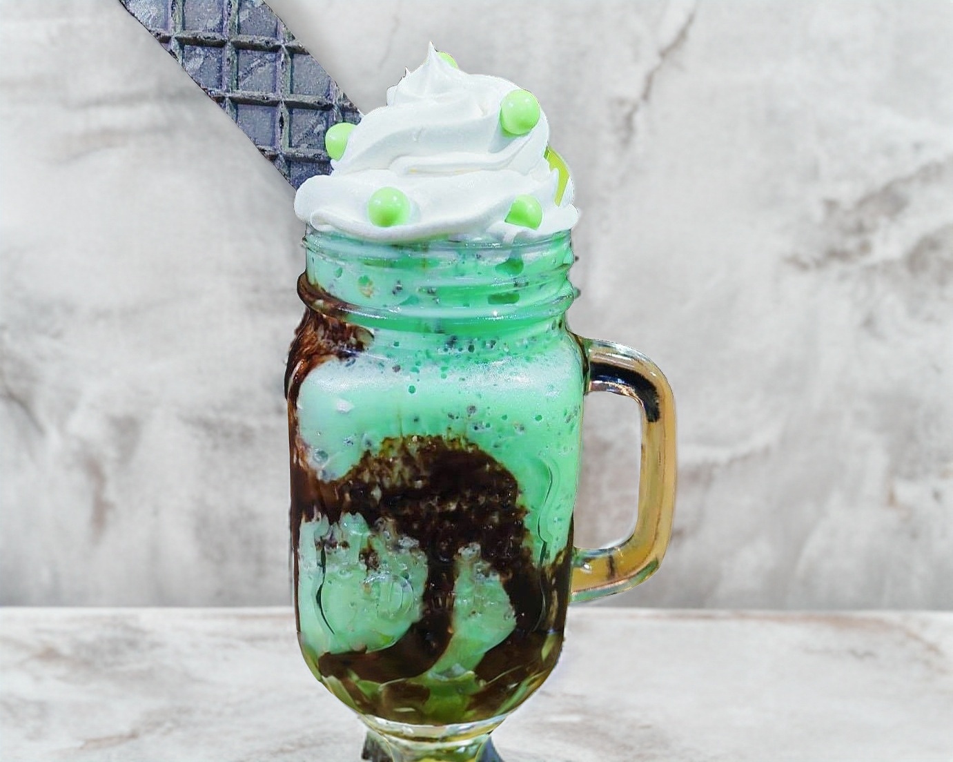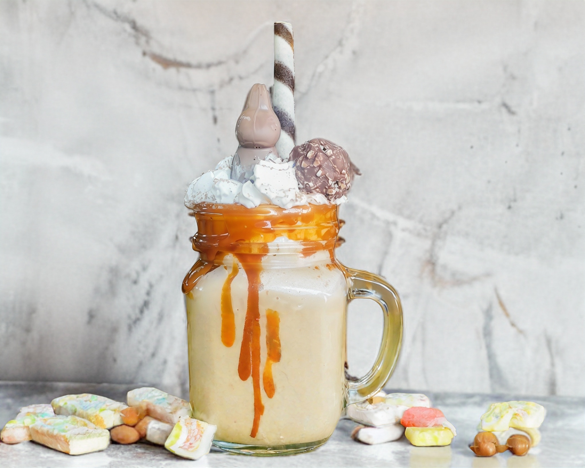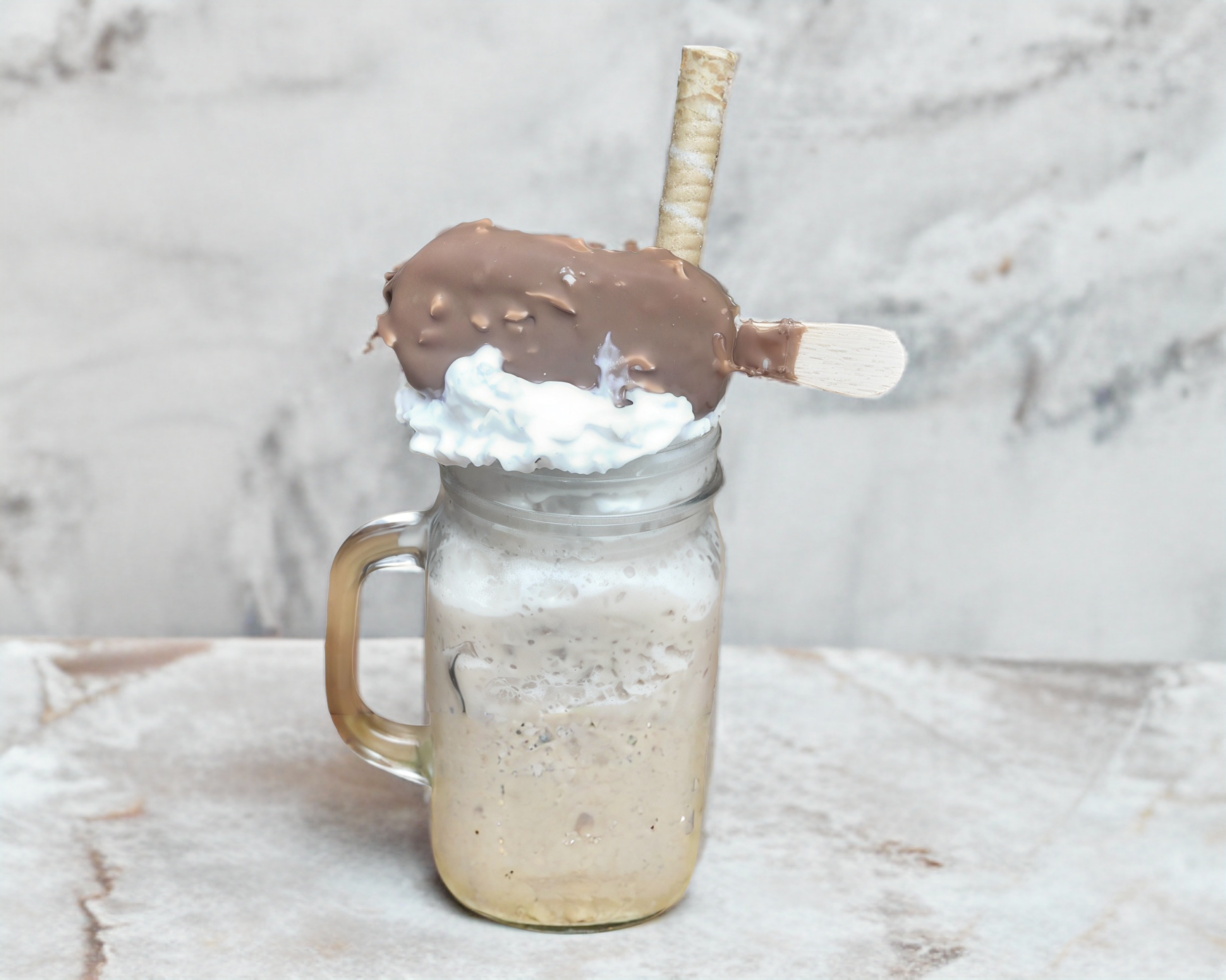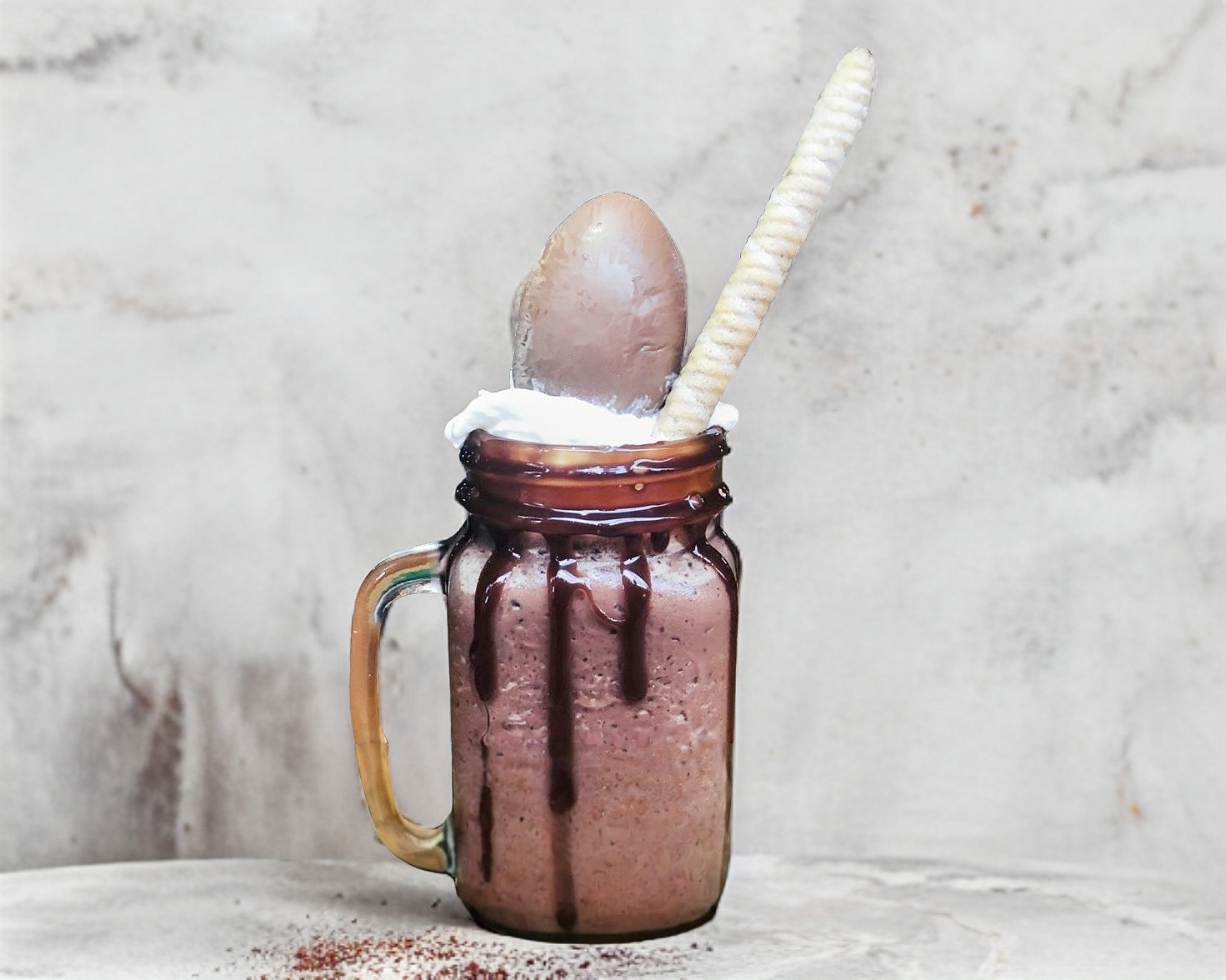 Frappe sabor chocolate, acompañado de crema batida, conejo turin y chocolate ferrero