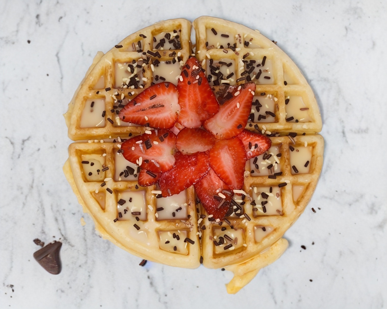 Waffle cubierto de lechera, fresas frescas y granillo de moka.