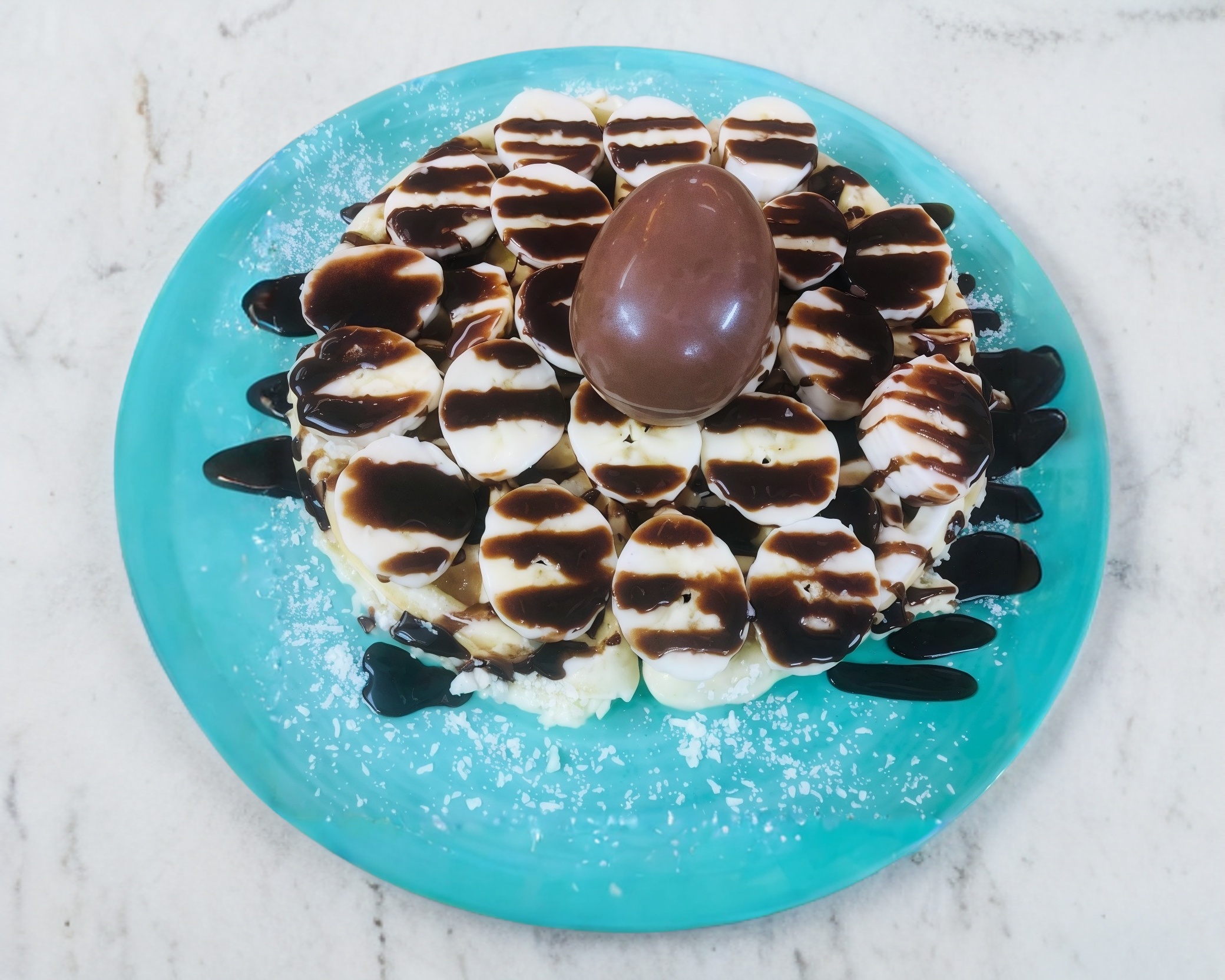 Cubierto de plátano, chocolate liquido y huevo Kinder.