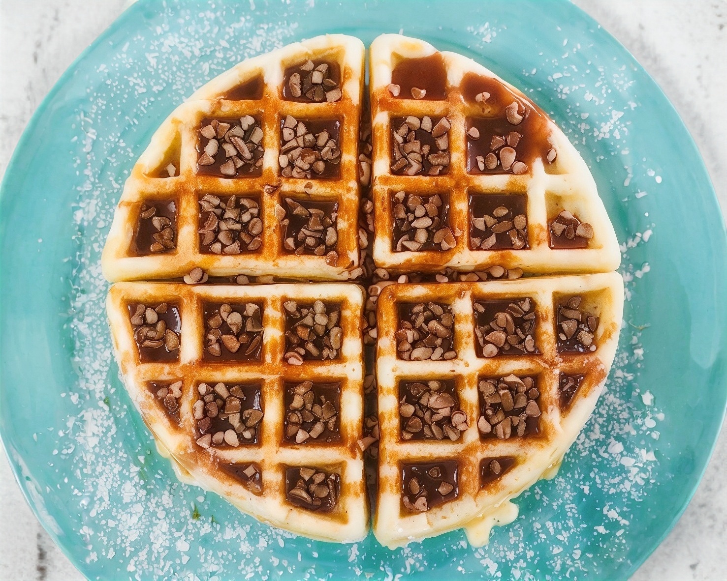 Waffle cubierto de cajeta y nuez.