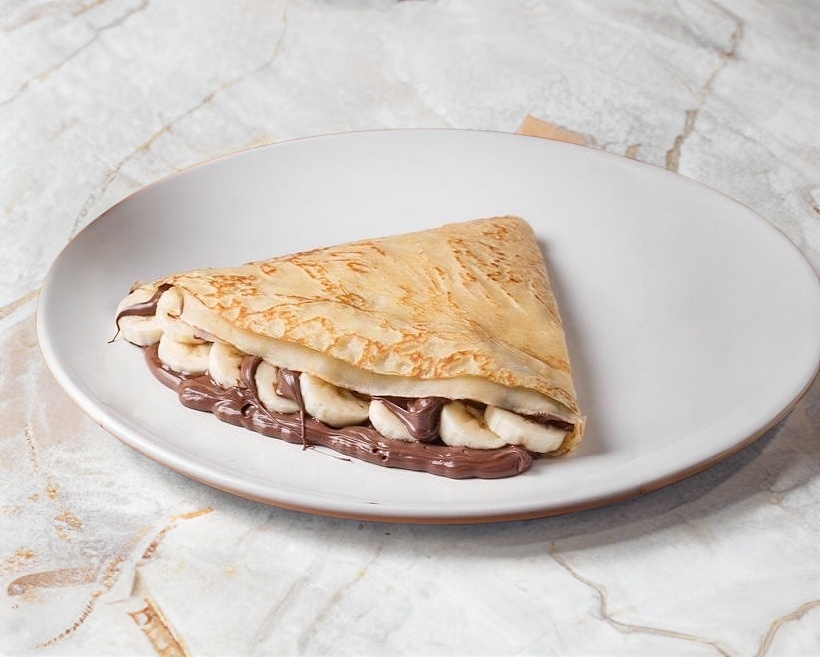 Crepa rellena de philadelphia cubierta de Nutella y plátano.