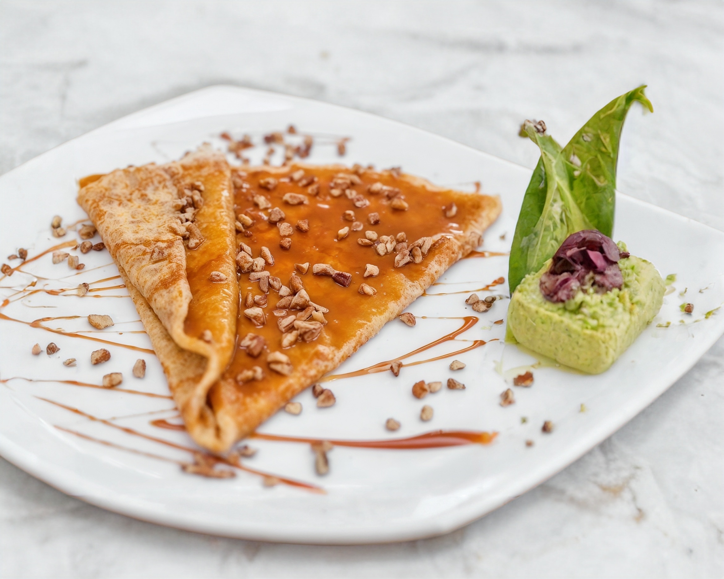 Crepa dulce cubierta de cajeta y nuez.