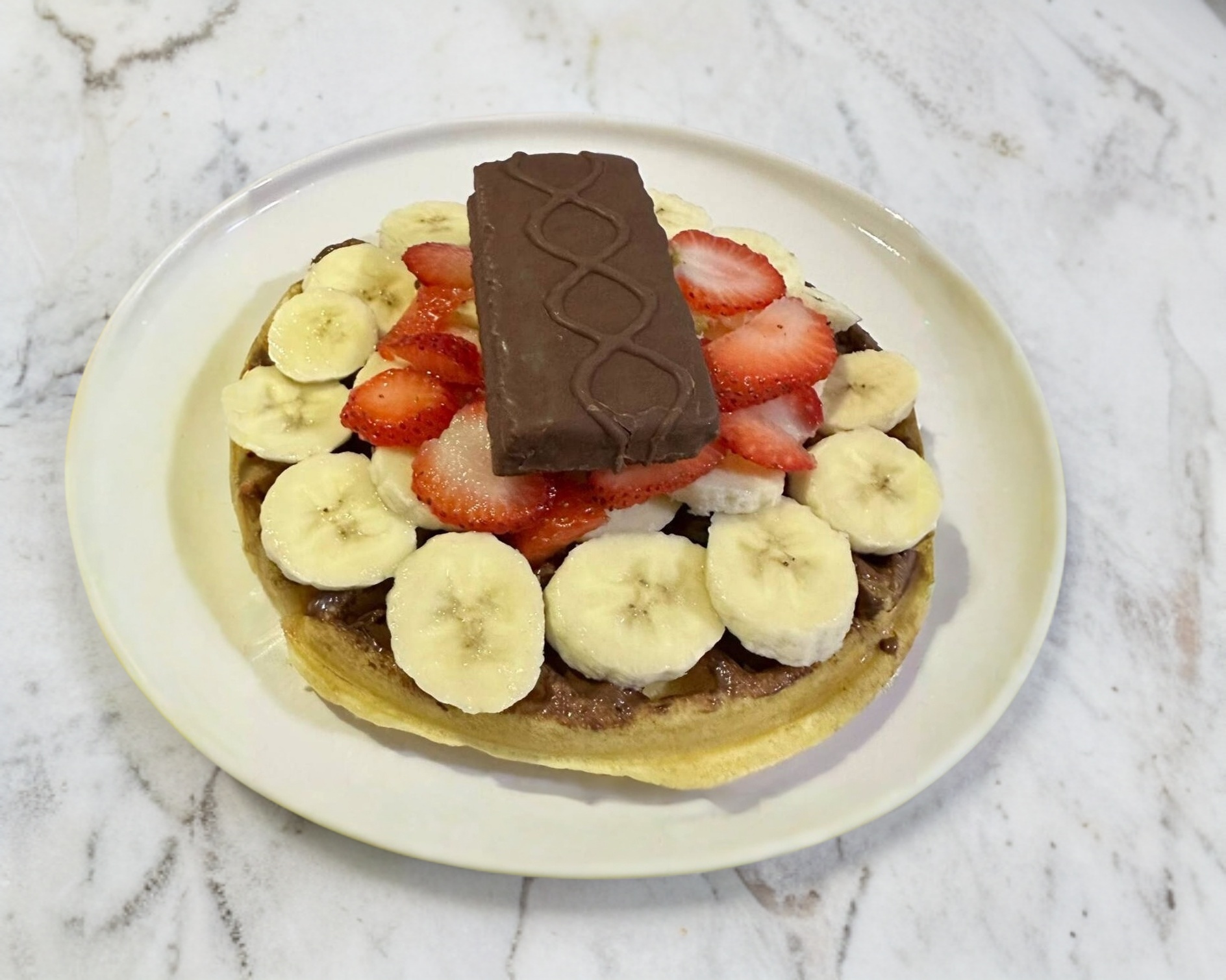 Waffle cubierto de Nutella, plátano, fresa y chocolate Kinder delice.