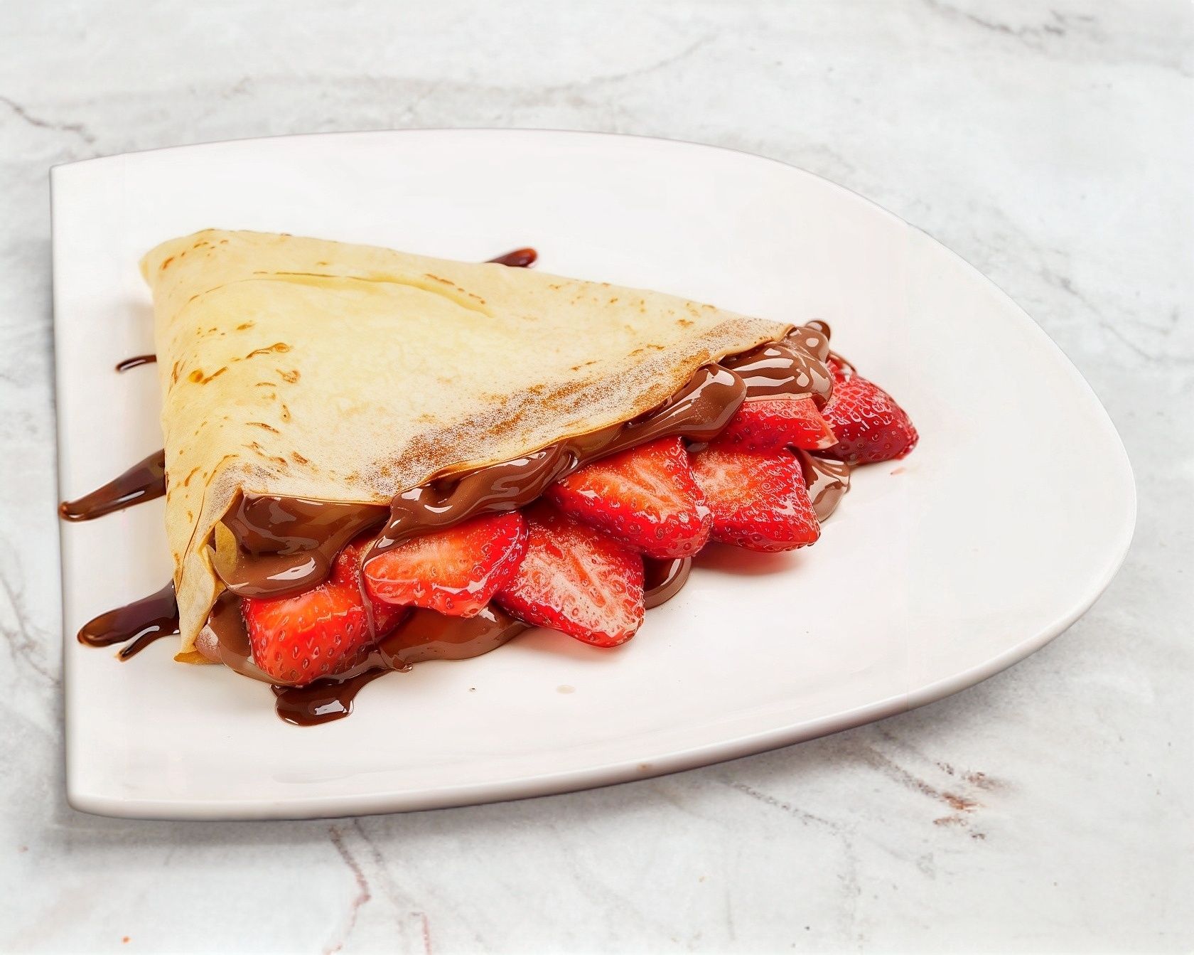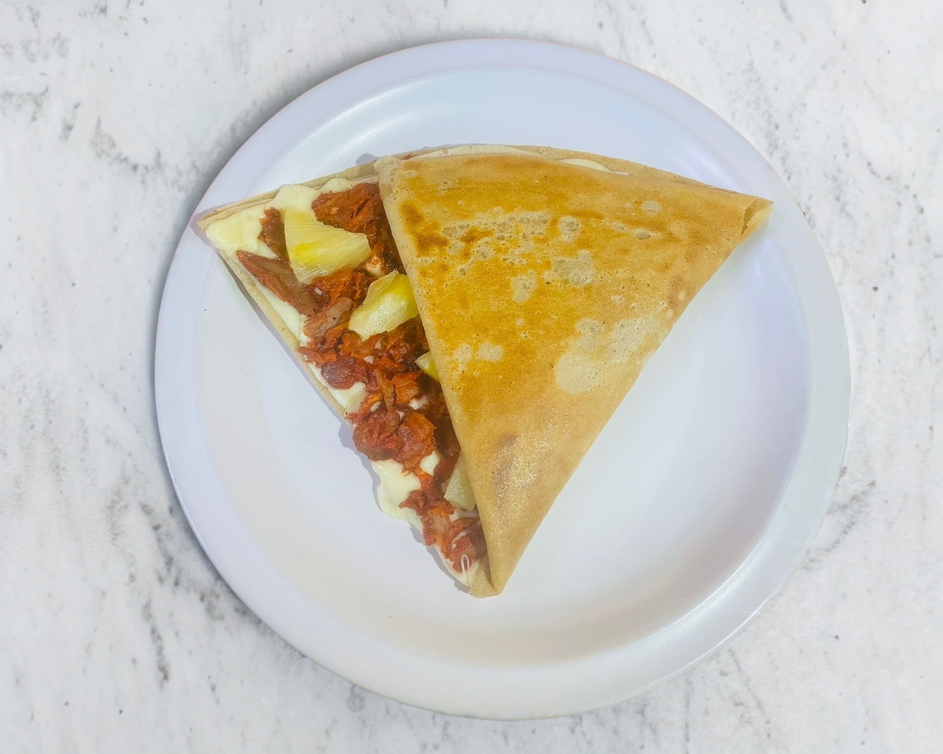 Crepa rellena de salsa de tomate, queso manchego, piña y jamón o pepperoni.