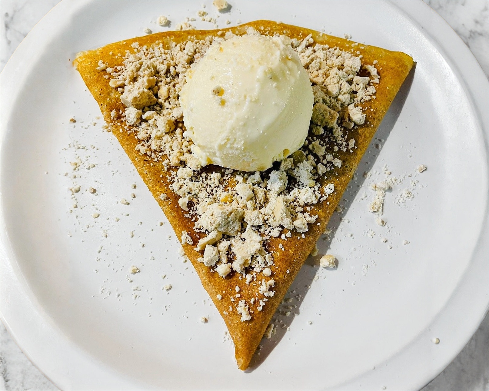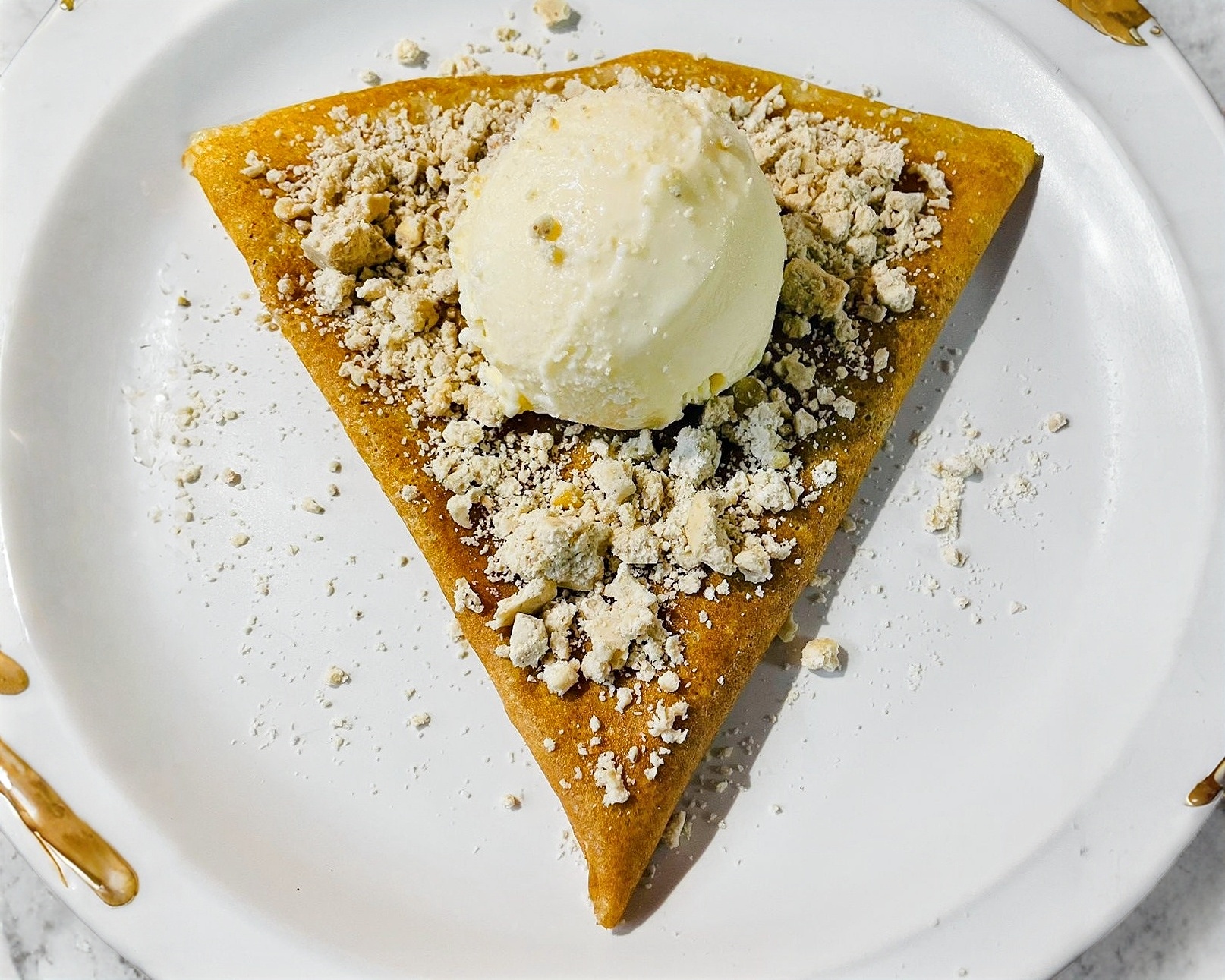 Cubierta de doraditas, bañadas en cajeta y helado de vainilla.