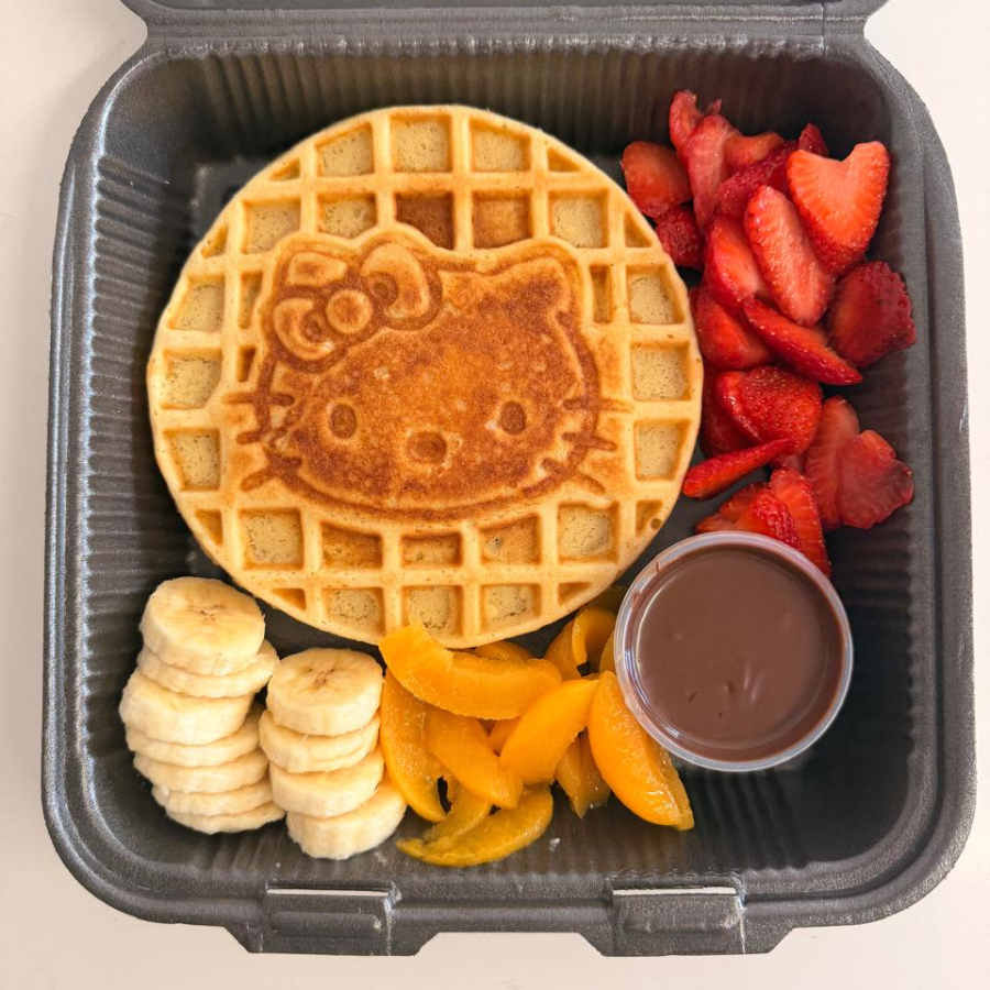 waffle tematico acompañado de platano, durazno, fresa y nutella.