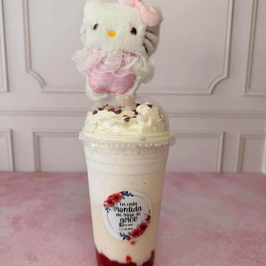 Frappe sabor horchata 500ml con jarabe de fresa natural y un llavero kitty de peluche