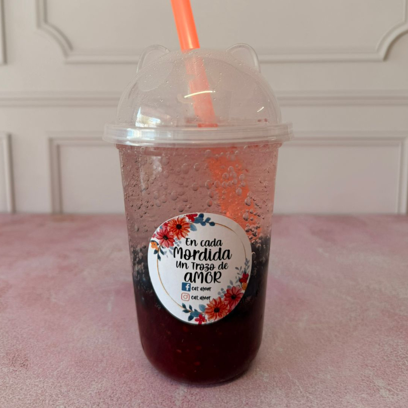 Soda italiana de 500ml en vaso de plastico en forma de gato, con perlas explosivas sabor mora.