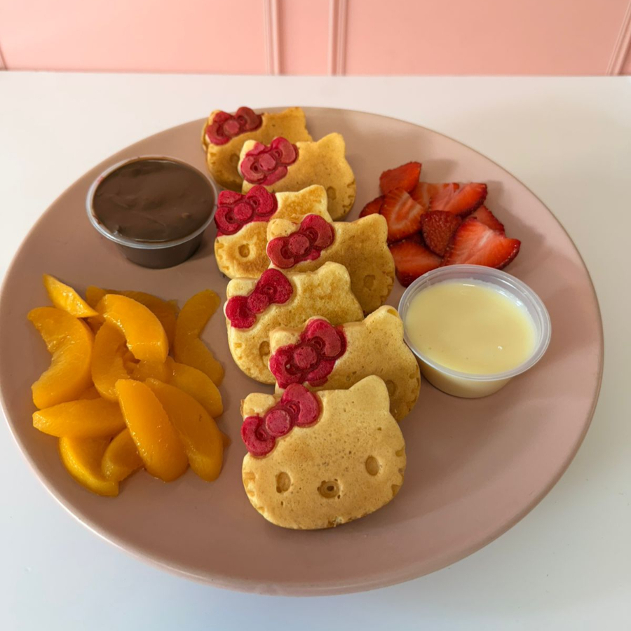 7 piezas de mini waffles tematicos, acompañados de dip de lechera, dip de nutella, fresa y durazno.