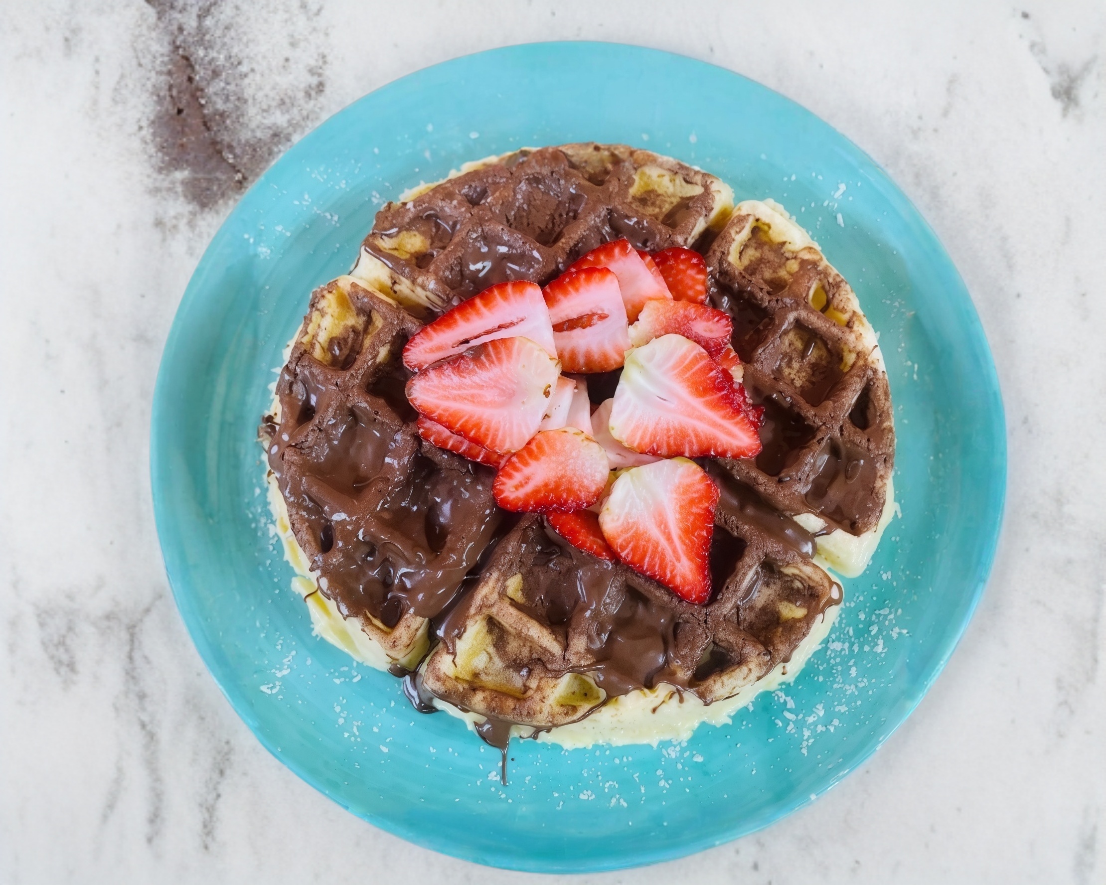 Waffle cubierto de nutella y fresas picada
