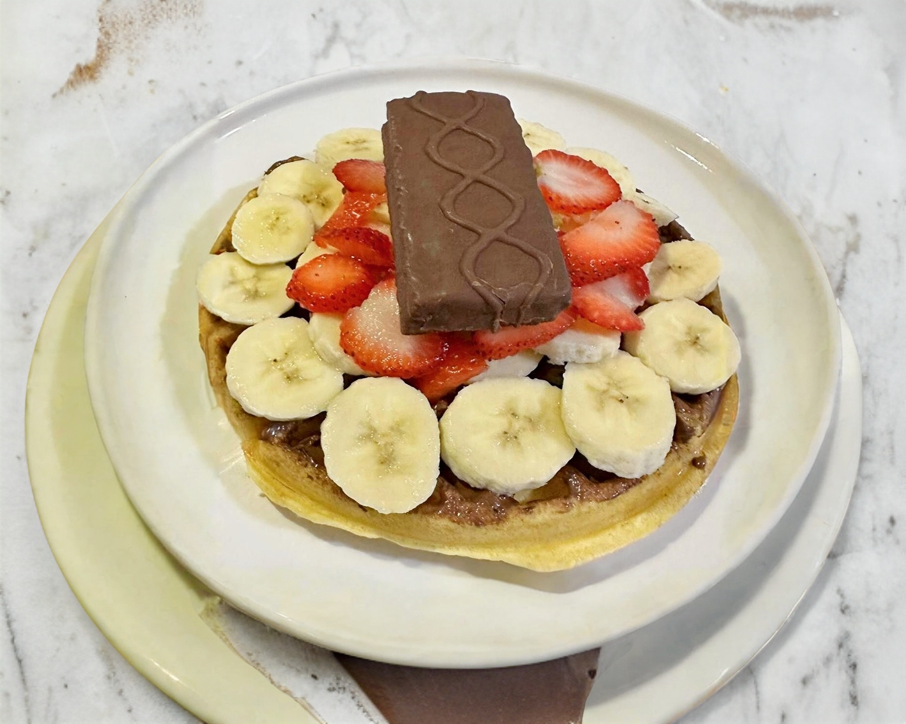 waffle cubierto de nutella, platano, fresa y chocolate kinder delice