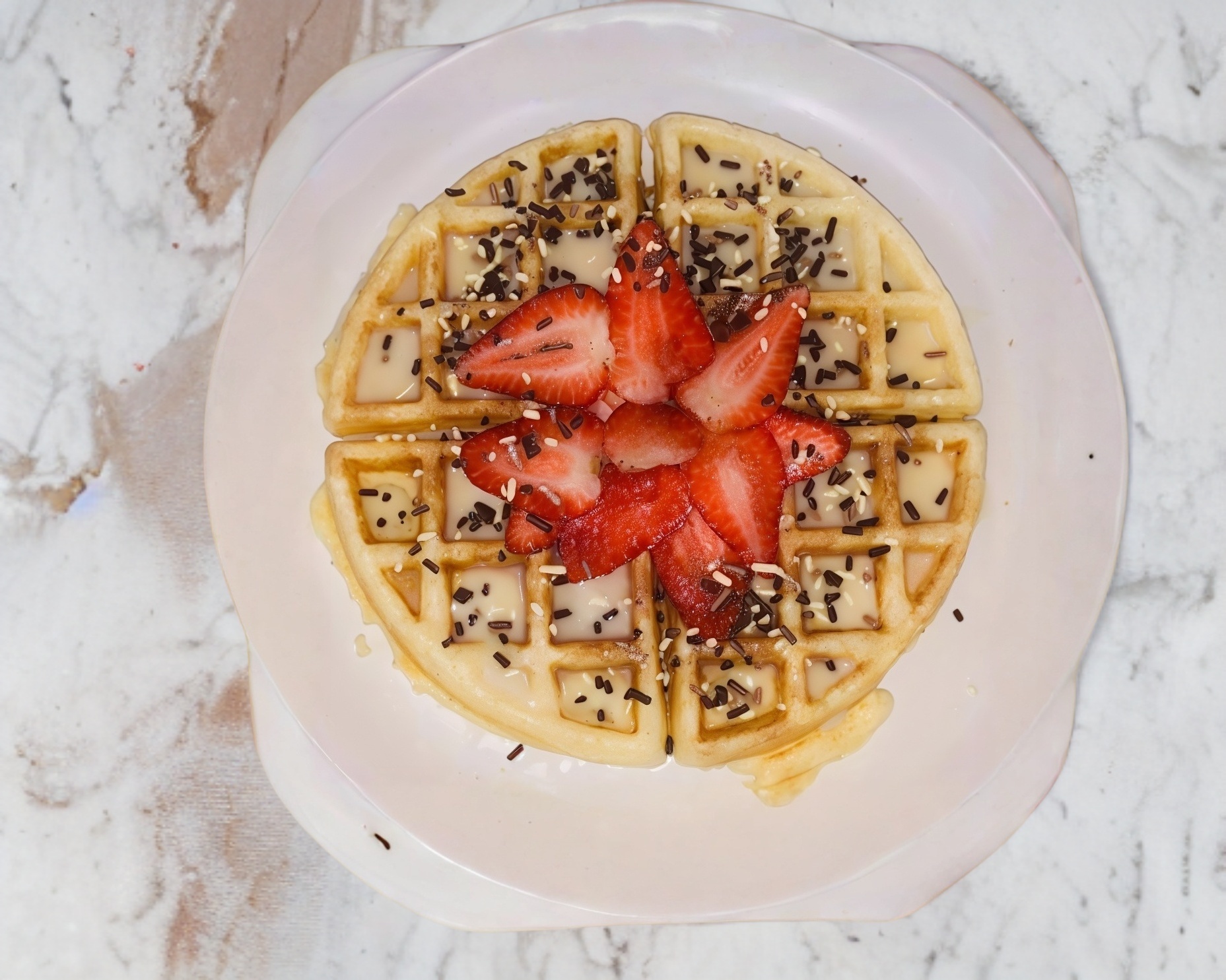 waffle cubierto de lechera, fresas frescas y granillo de moka