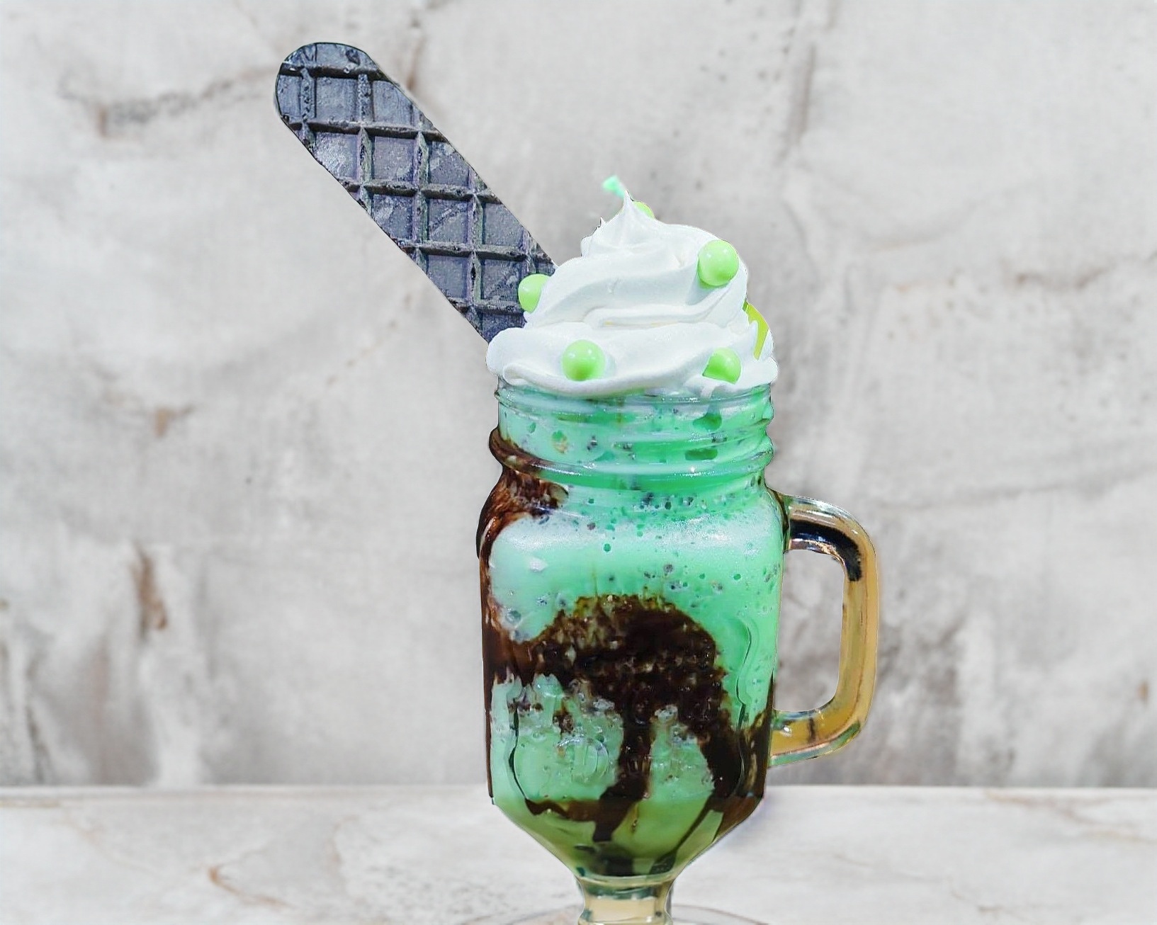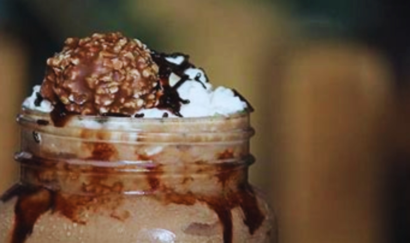 Frappe sabor chocolate, acompañado de crema batida, conejo turin y chocolate ferrero