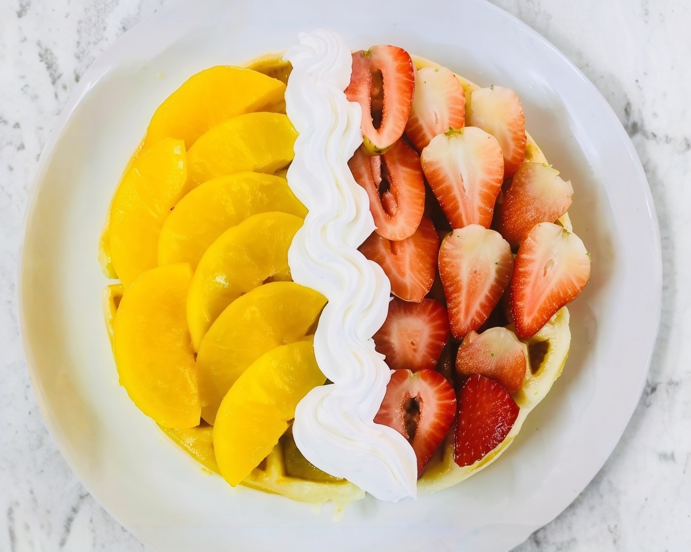 waffle cubierto de lechera, crema batida, durazno y fresa fresca