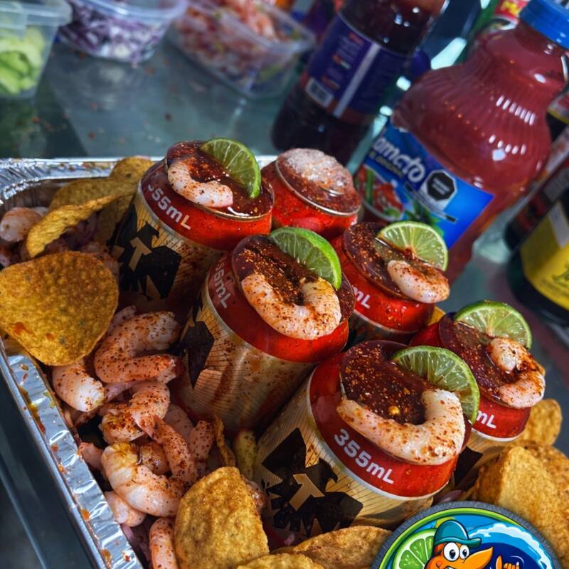 Charola con cervezas Tecate bien frías, preparadas con limón, salsas negras, sal y chile en polvo. Incluye botana, limón extra y salsas al gusto. Ideal para compartir.