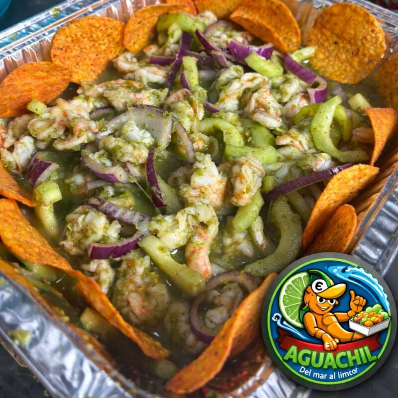 Aguachile verde preparado al momento con camarón fresco, pepino, cebolla morada, salsa verde de limón y chile, acompañado de aguacate y tostadas crujientes. Fresco, picosito y lleno de sabor.