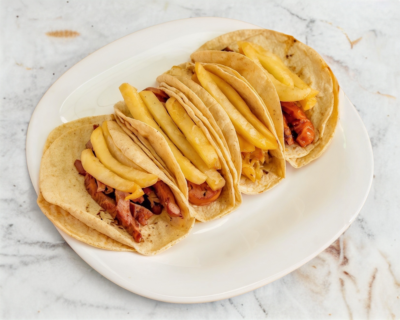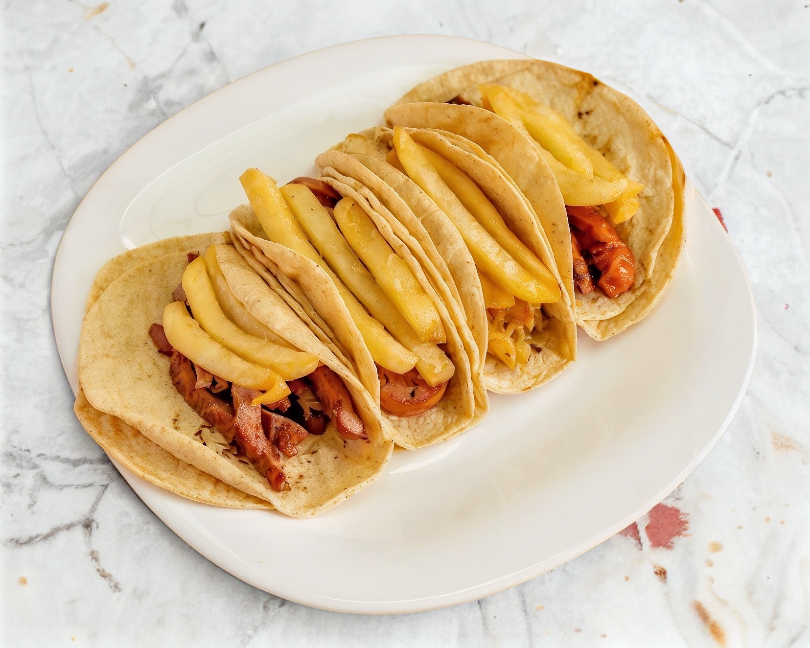 Envuelto en tocino, relleno de queso gouda con papas y ensalada.