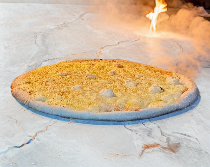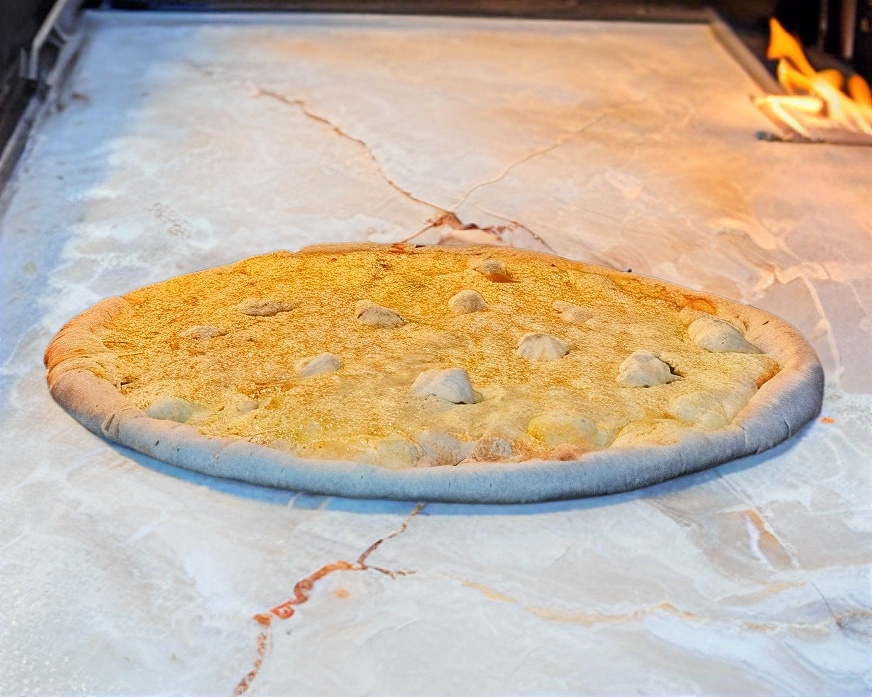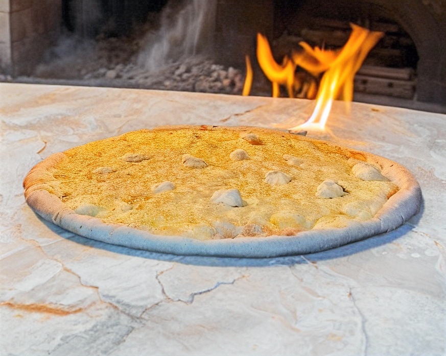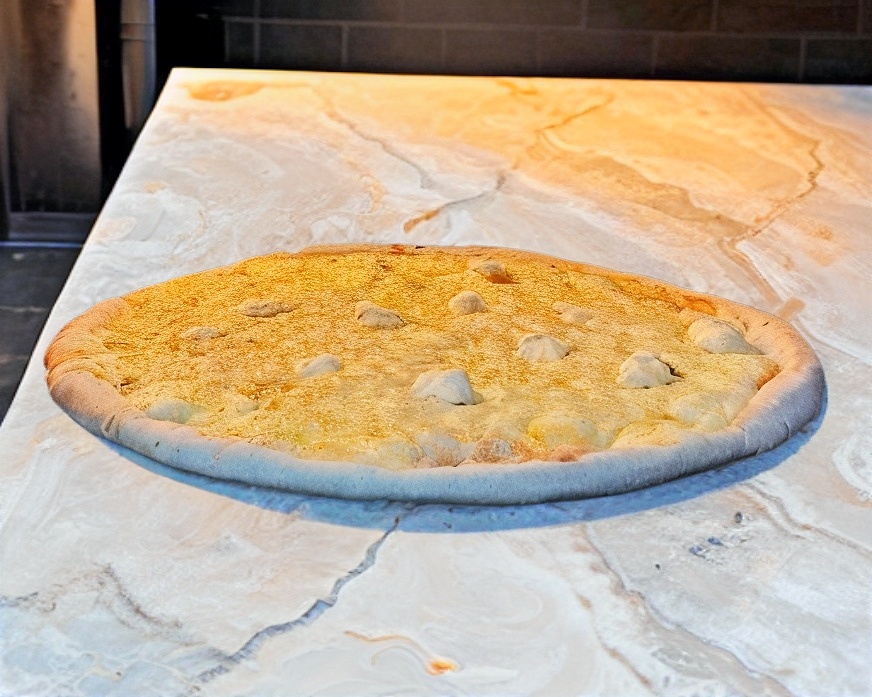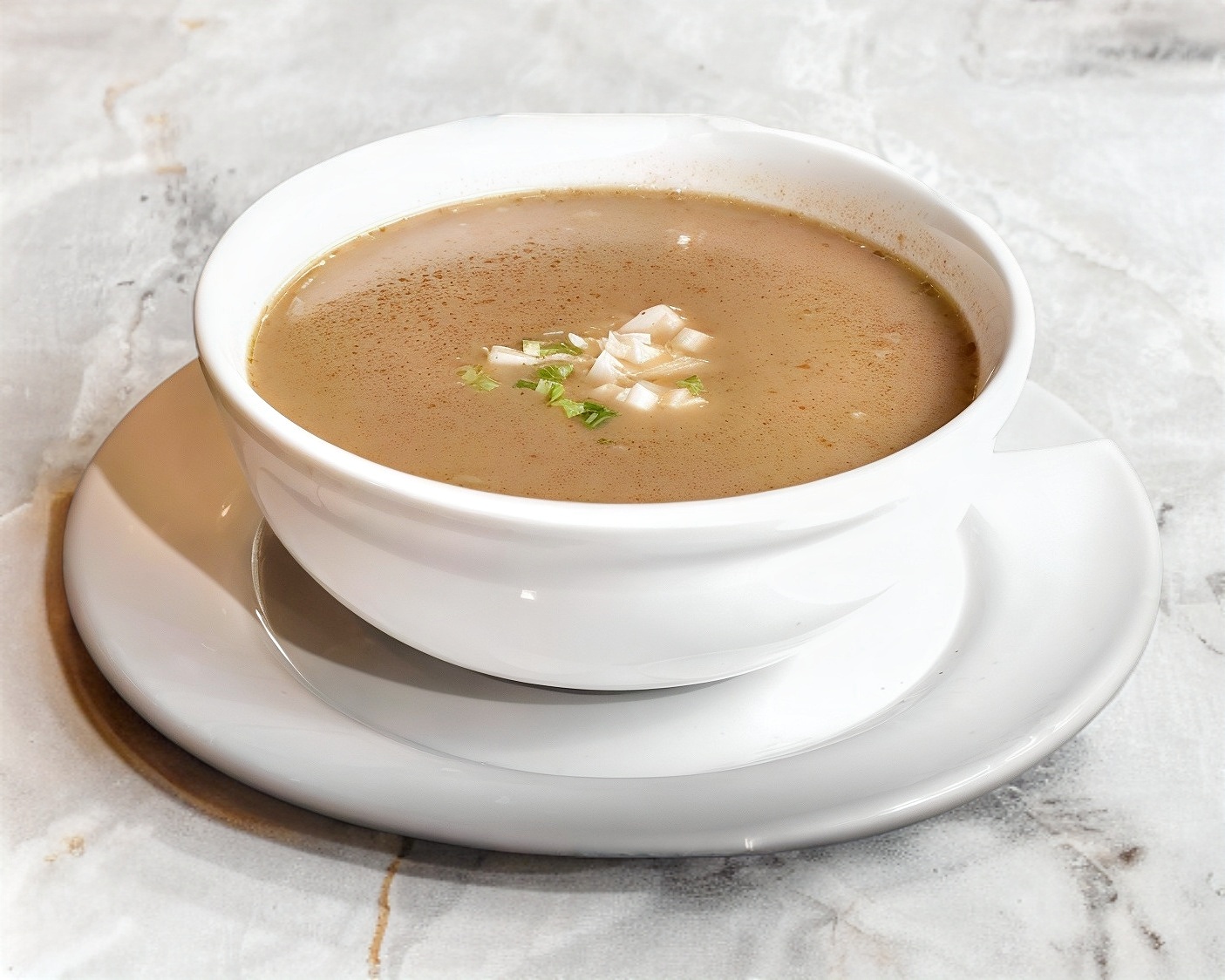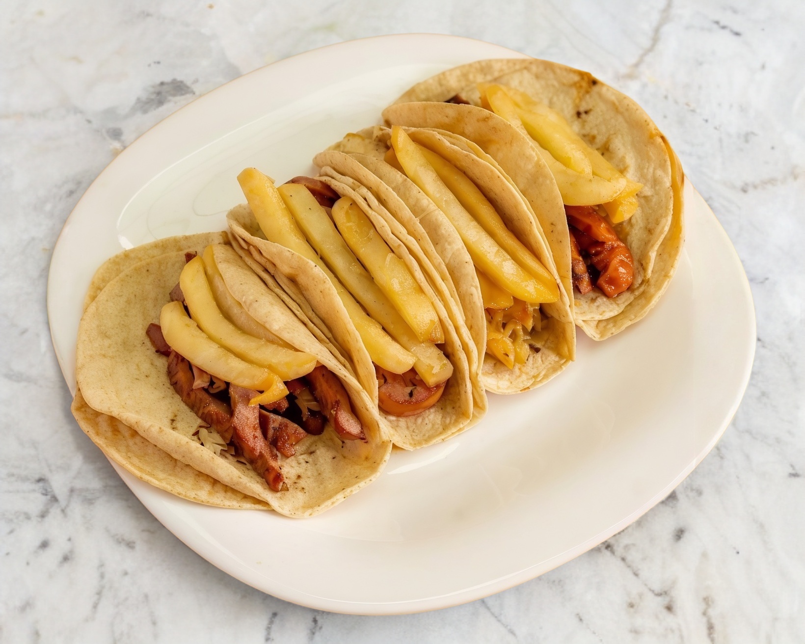 Salchicha blanca de ternera con cebolla frita, tocino frito y papas.