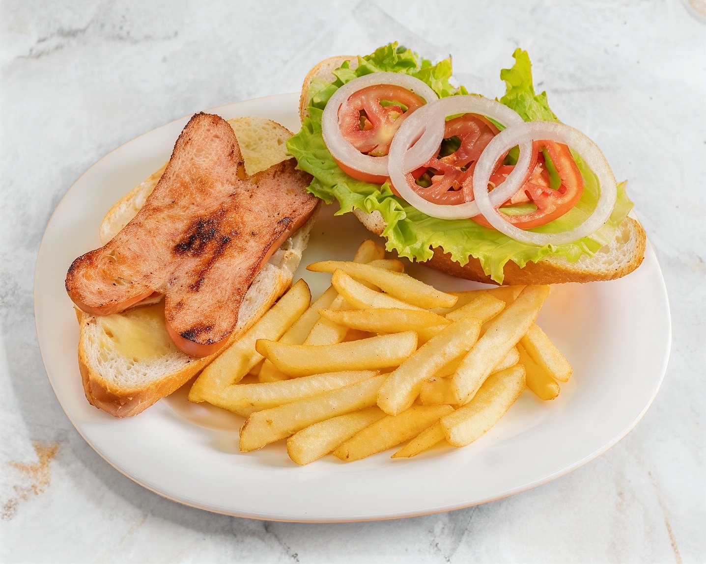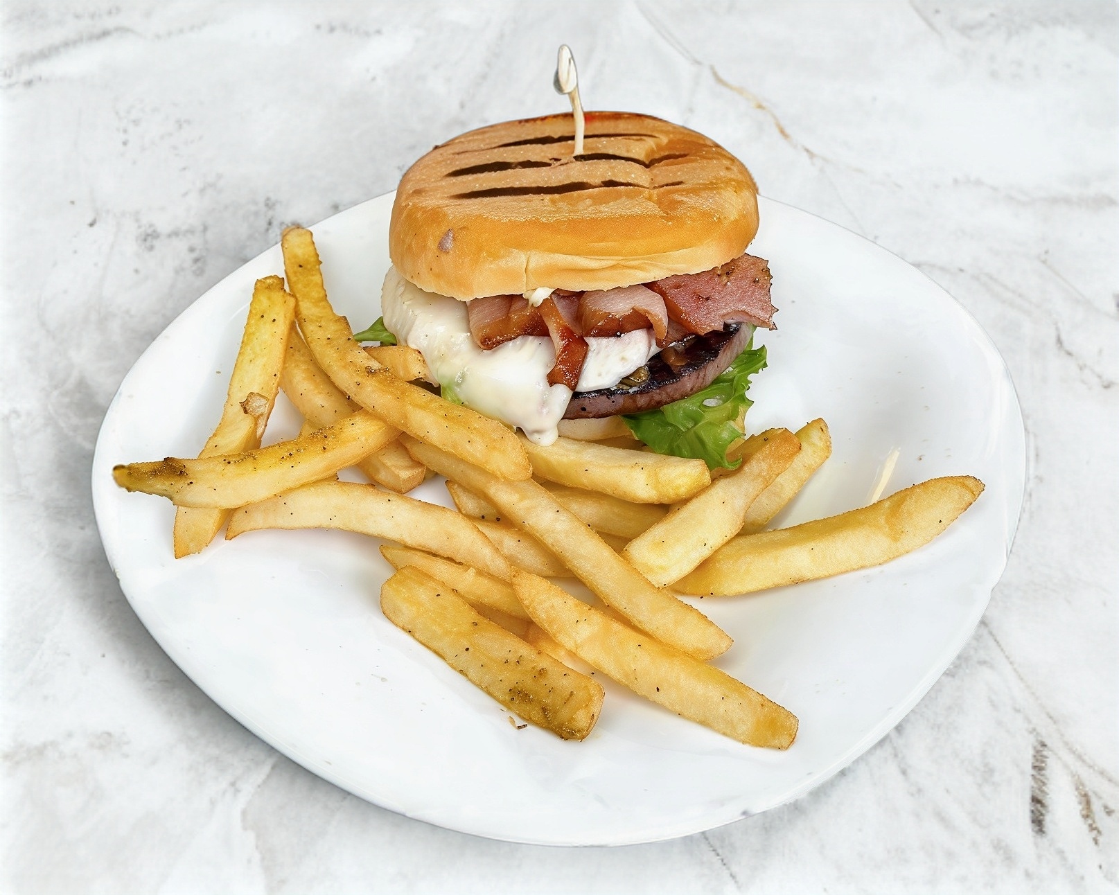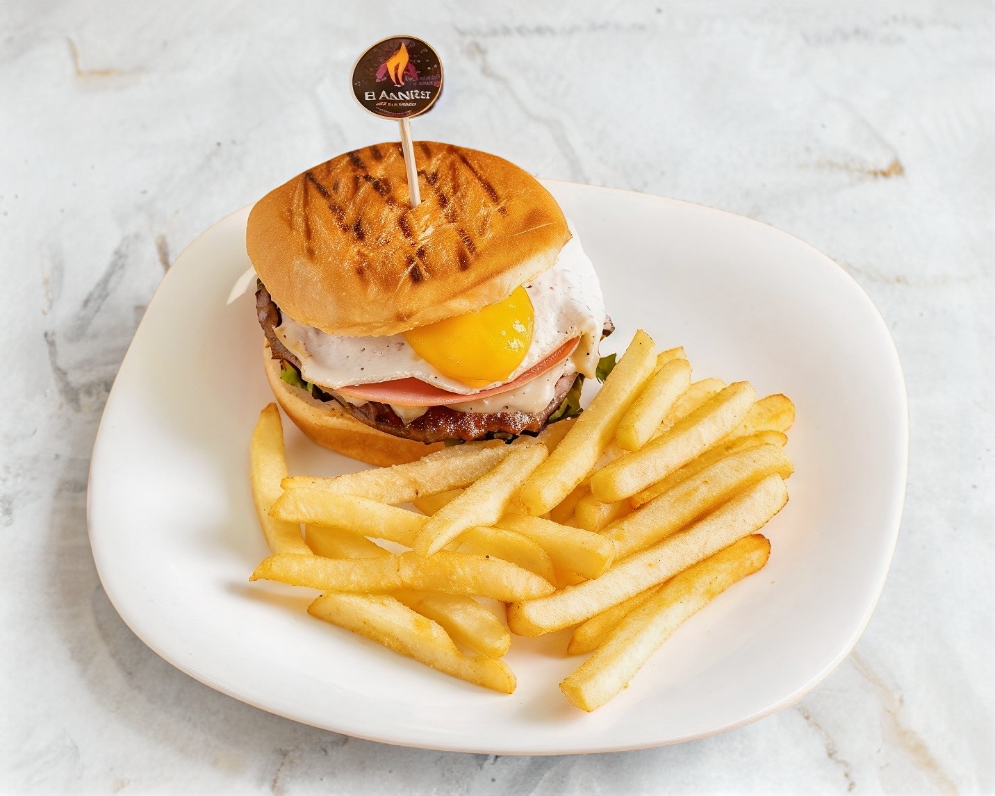 En pan brioche, 150 g de sirloin, jamón, queso gouda, huevo frito y papas.