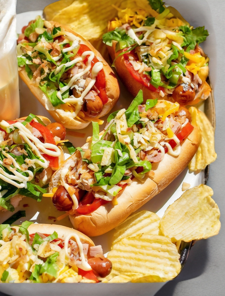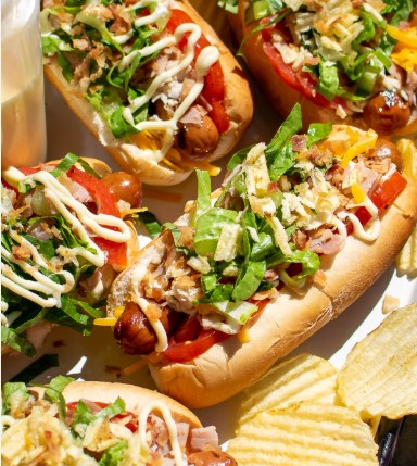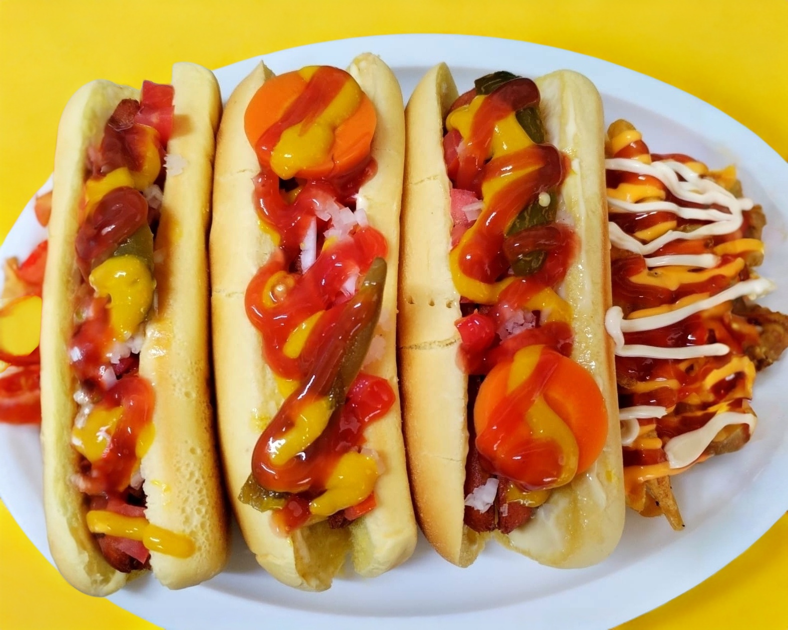 3 HOT DOGS CON COCHINITA Y PAPAS A LA FRANCESA