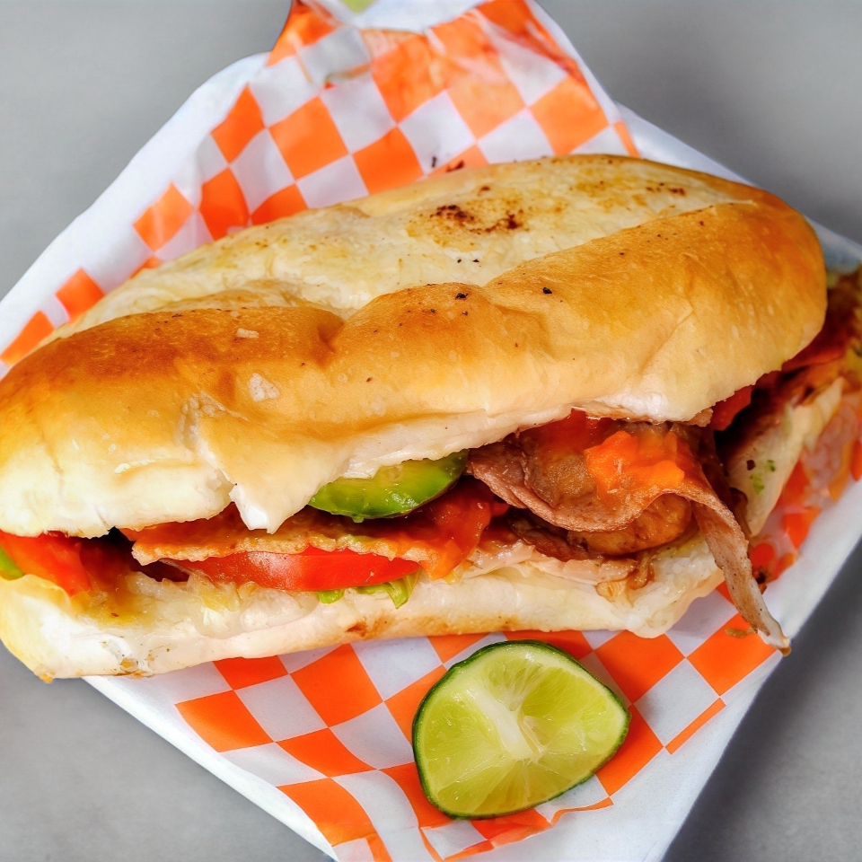 BOLILLO ,FRIJOLES,MAYONESA,JITOMATE,AGUACATE,BISTECK DE RES ASADO ,CHILES EN VINAGRE,QUESO GOUDA.