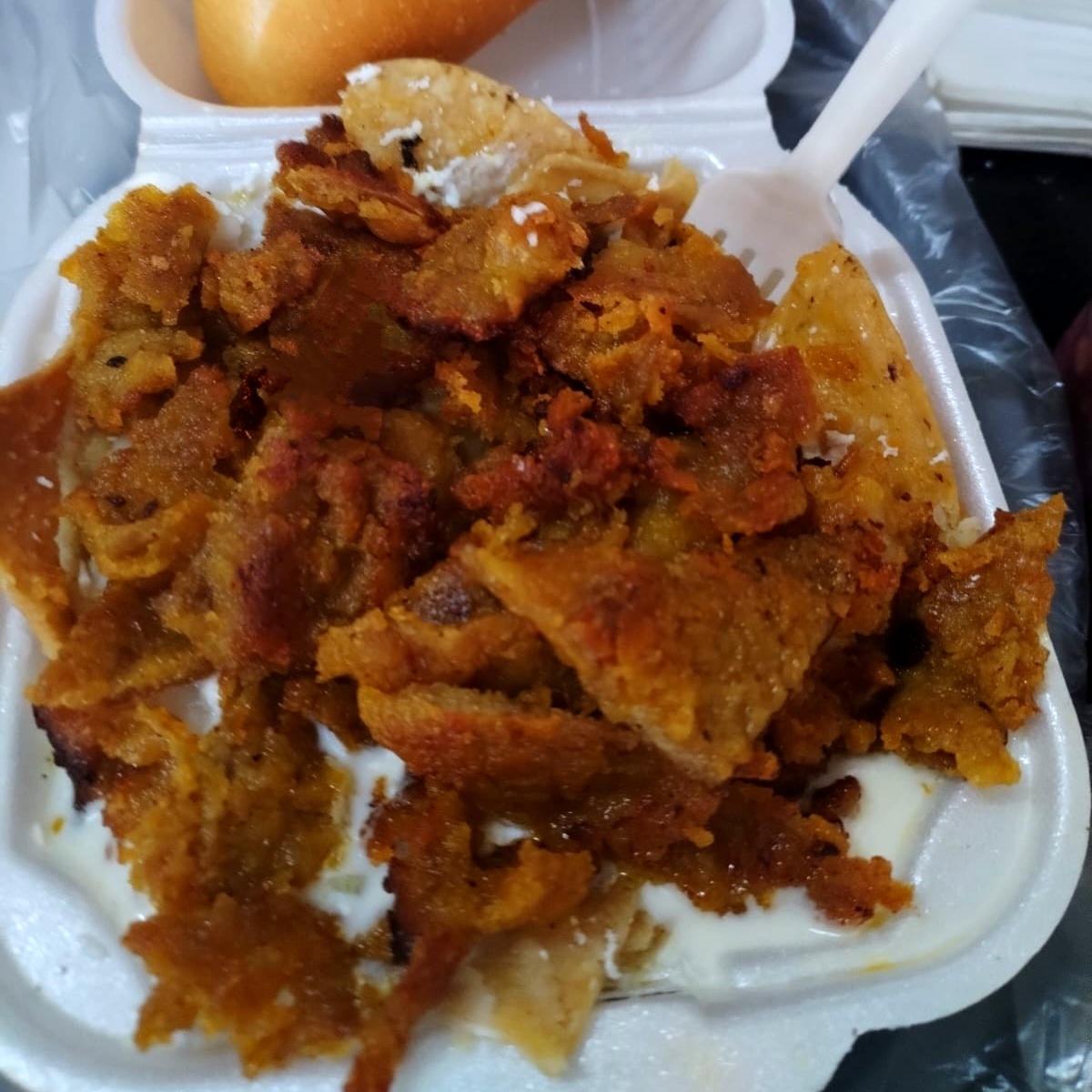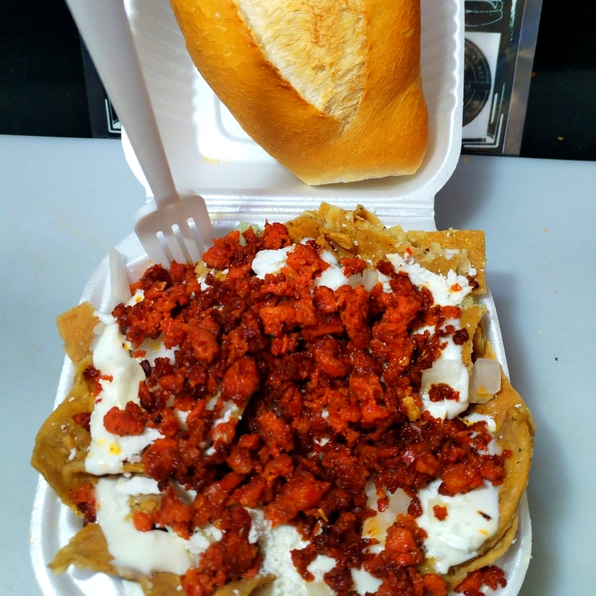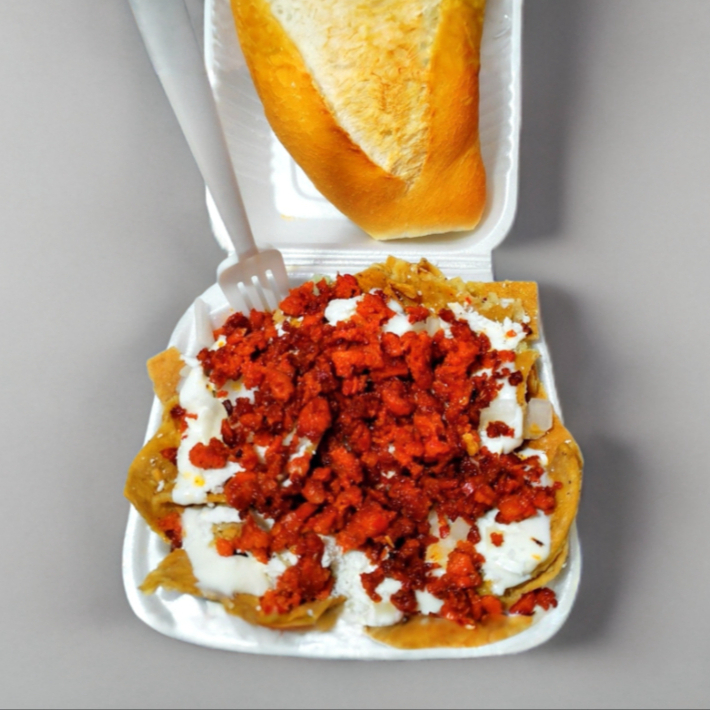 TOTOPOS BAÑADOS EN SALSA VERDE, LONGANIZA,CREMA,QUESO DOBLE CREMA,CEBOLLA BLANCA,Y UNA PIEZA DE BOLILLO.