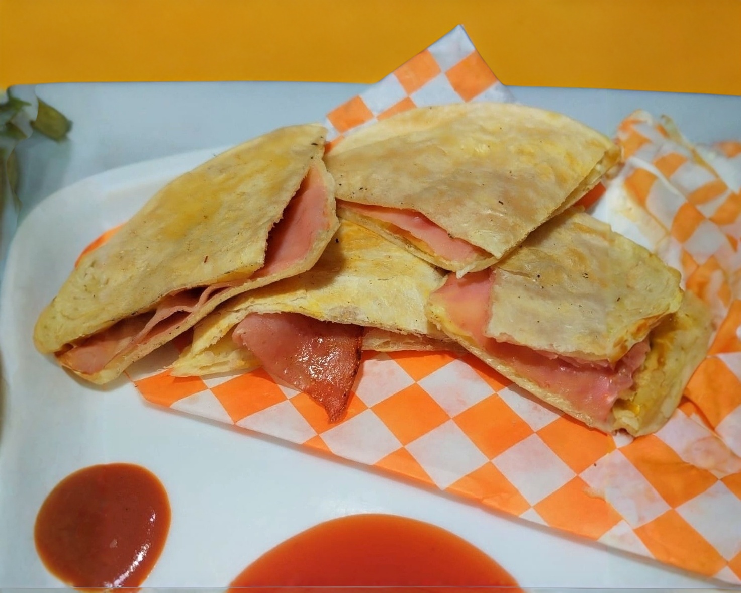 3 TORTILLAS DE HARINA FRITA,RELLENA DE QUESO GOUDA,JAMON Y PIÑA, ACOMPAÑADOS DE PAPAS A LA FRANCESA