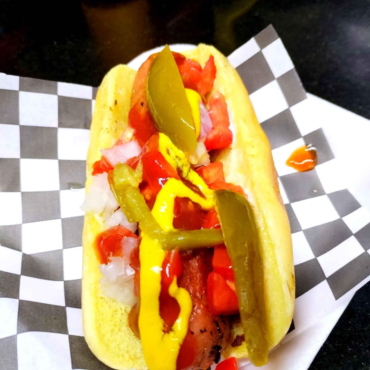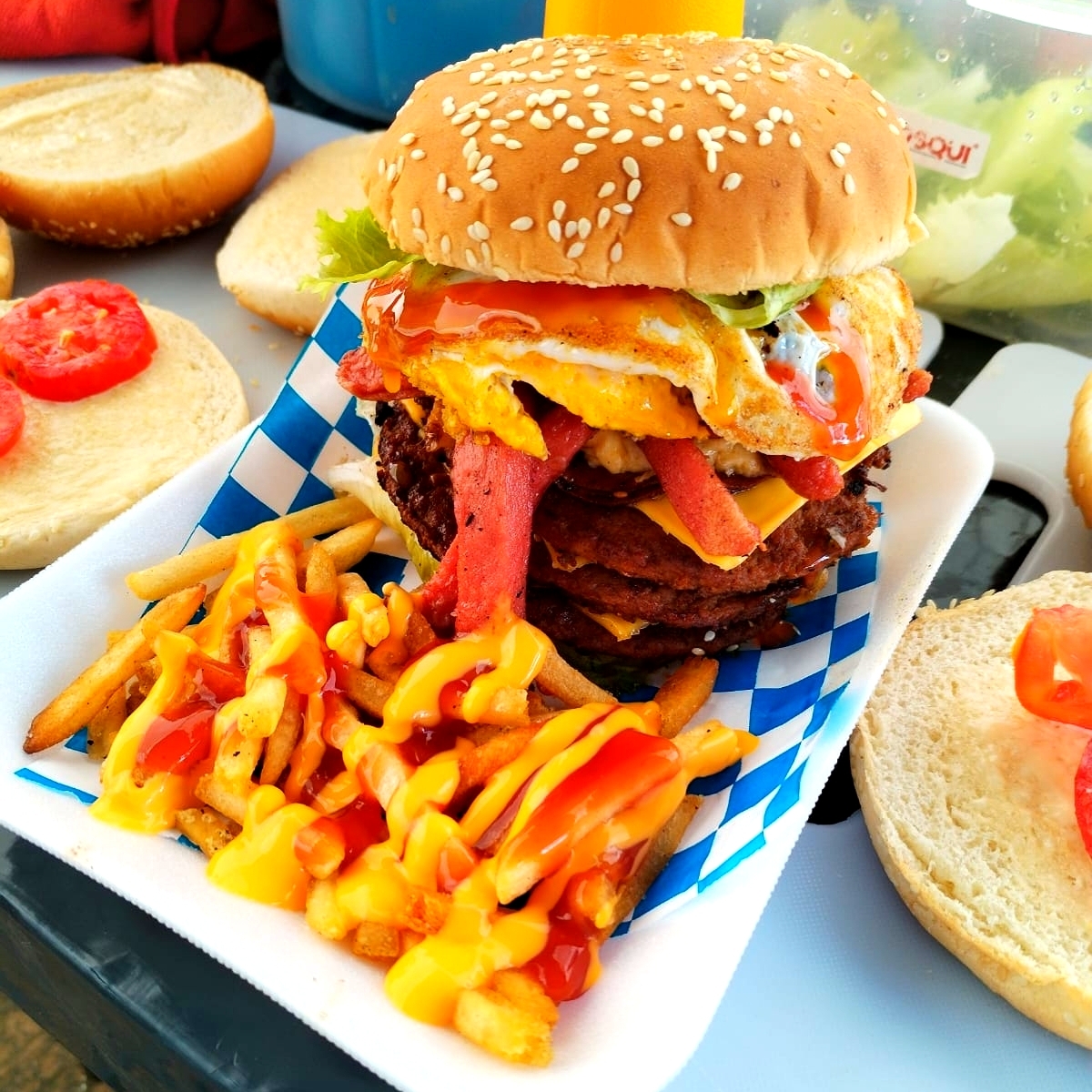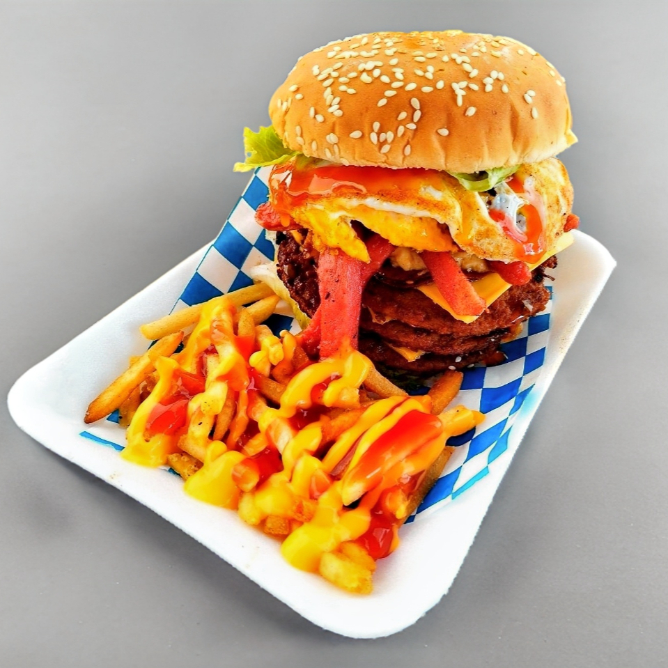 PAN, TRIPLE CARNE, DOBLE QUESO AMERICANO,JAMON,1 HUEVO ESTRELLADO SELLADO,CEBOLLA CARAMELIZADA ,QUESO GOUDA, SALCHICHA,PIÑA, JITOMATE,LECHUGA ITALIANA,PEPINILLOS,MOSTAZA, CATSUP Y MAYONESA.