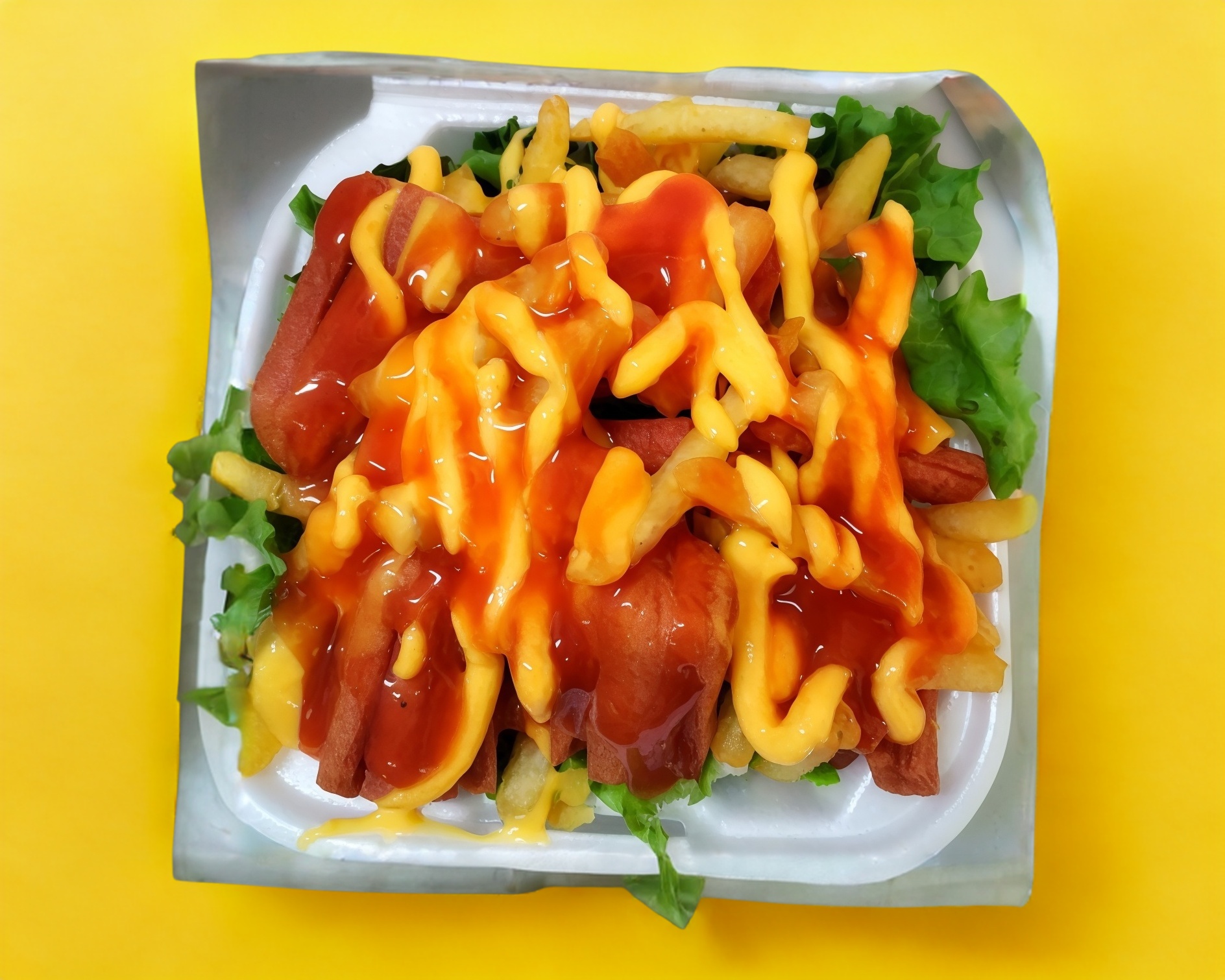 DOMO DE PAPAS A LA FRANCESA Y SALCHICHAS, ACOMPAÑADAS DE CATSUP,QUESO AMARILLO LIQUIDO,MAYONESA Y SALSA