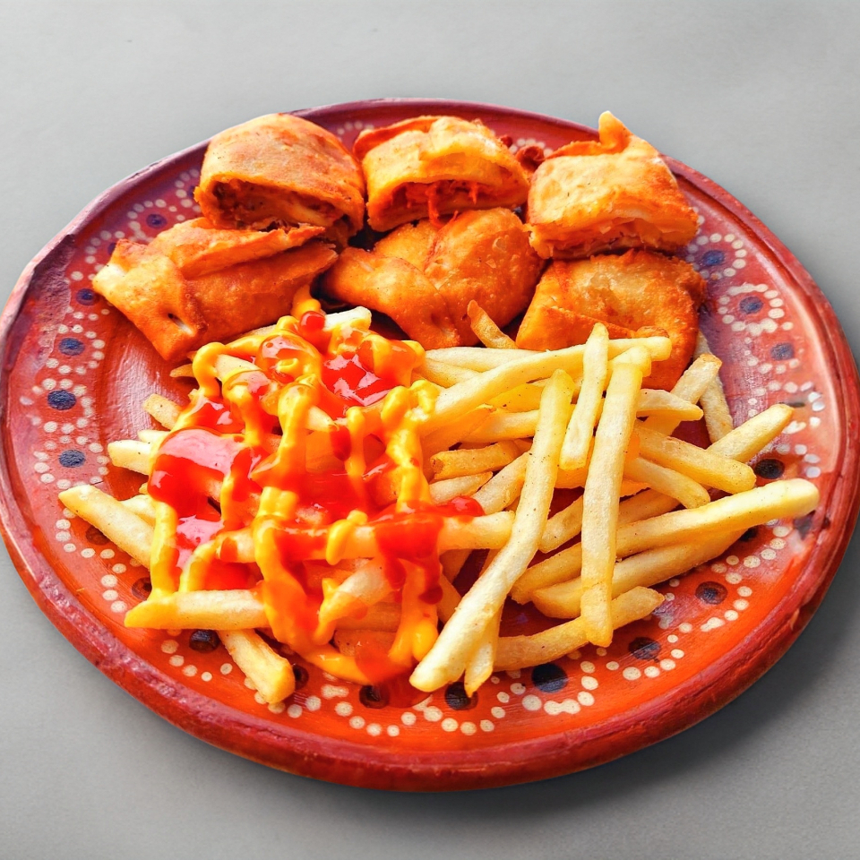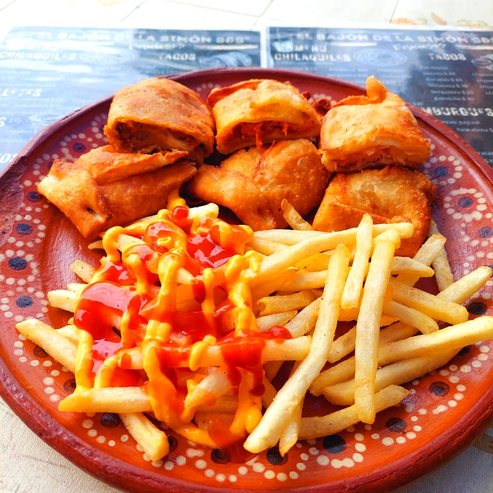 3 TORTILLAS DE HARINA FRITA,RELLENA DE QUESO GOUDA,LONGANIZA,CHILE VERDE PICADO,CEBOLLA, ACOMPAÑADOS DE PAPAS A LA FRANCESA