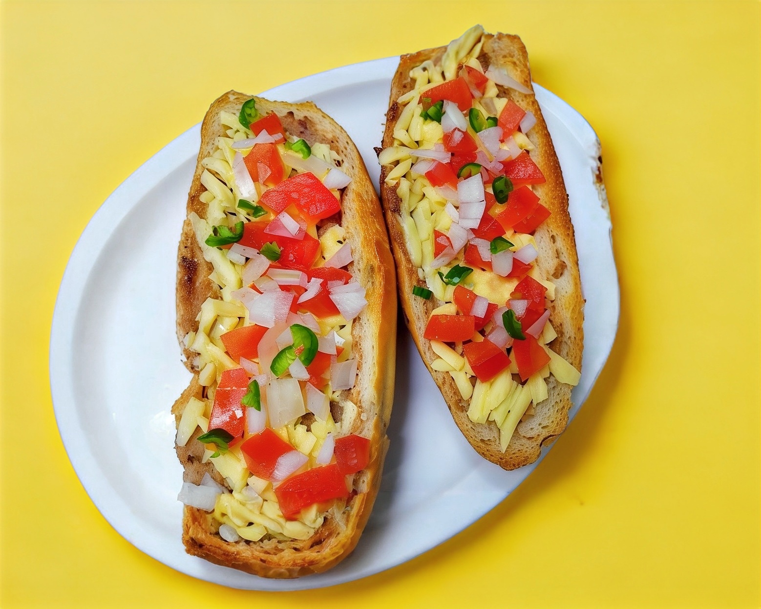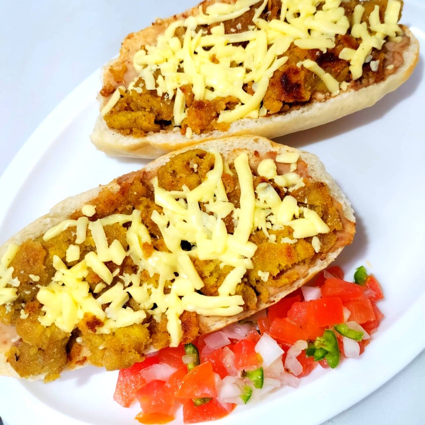 BOLILLO,FRIJOLES BAYOS REFRITOS,QUESO GOUDA,PICO DE GALLO.