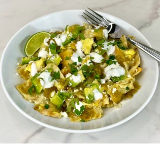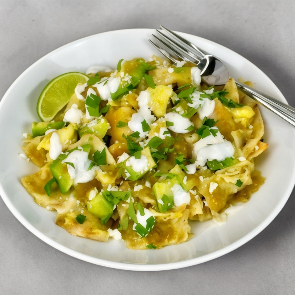 TOTOPOS BAÑADOS EN SALSA VERDE,DOS HUEVOS REVUELTOS,CREMA,QUESO DOBLE CREMA,CEBOLLA BLANCA,Y UNA PIEZA DE BOLILLO.