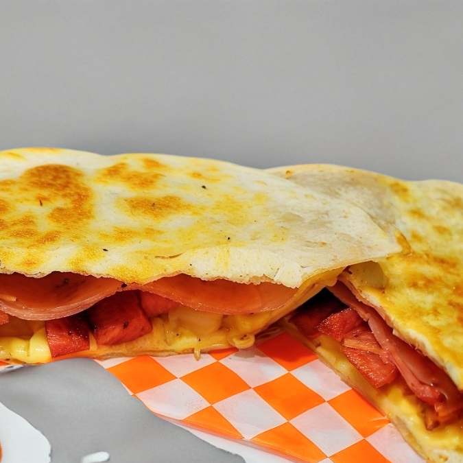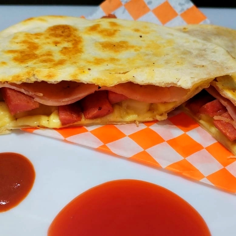 DOBLE TORTILLA DE HARINA,JAMON,QUESO GOUDA,QUESO AMERICANO,SALCHICHA Y PIÑA.