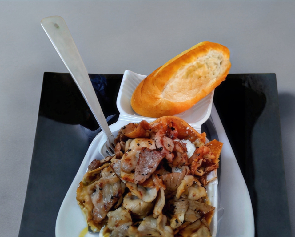 TOTOPOS BAÑADOS EN SALSA VERDE, BISTECK DE RES,CREMA, QUESO DOBLE CREMA,CEBOLLA BLANCA,Y UNA PIEZA DE BOLILLO.