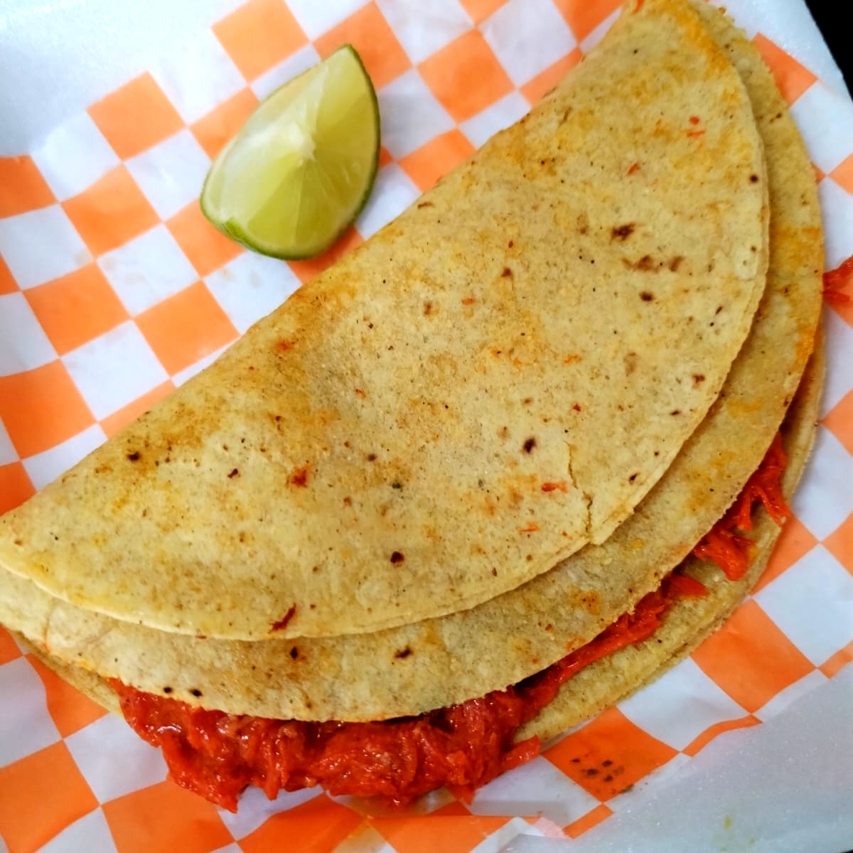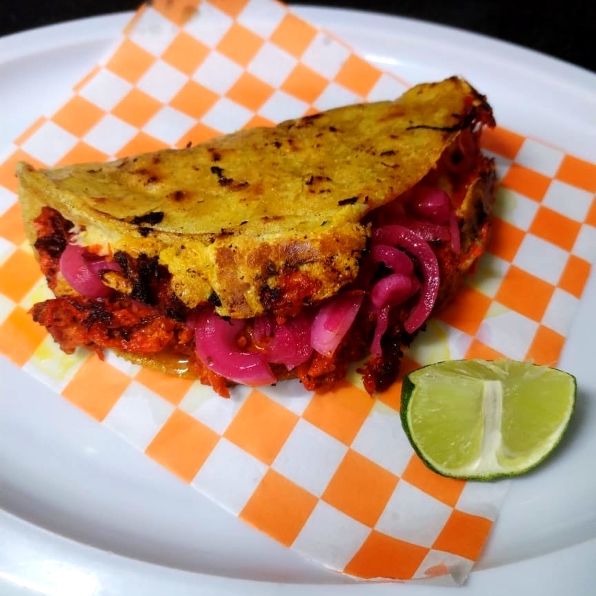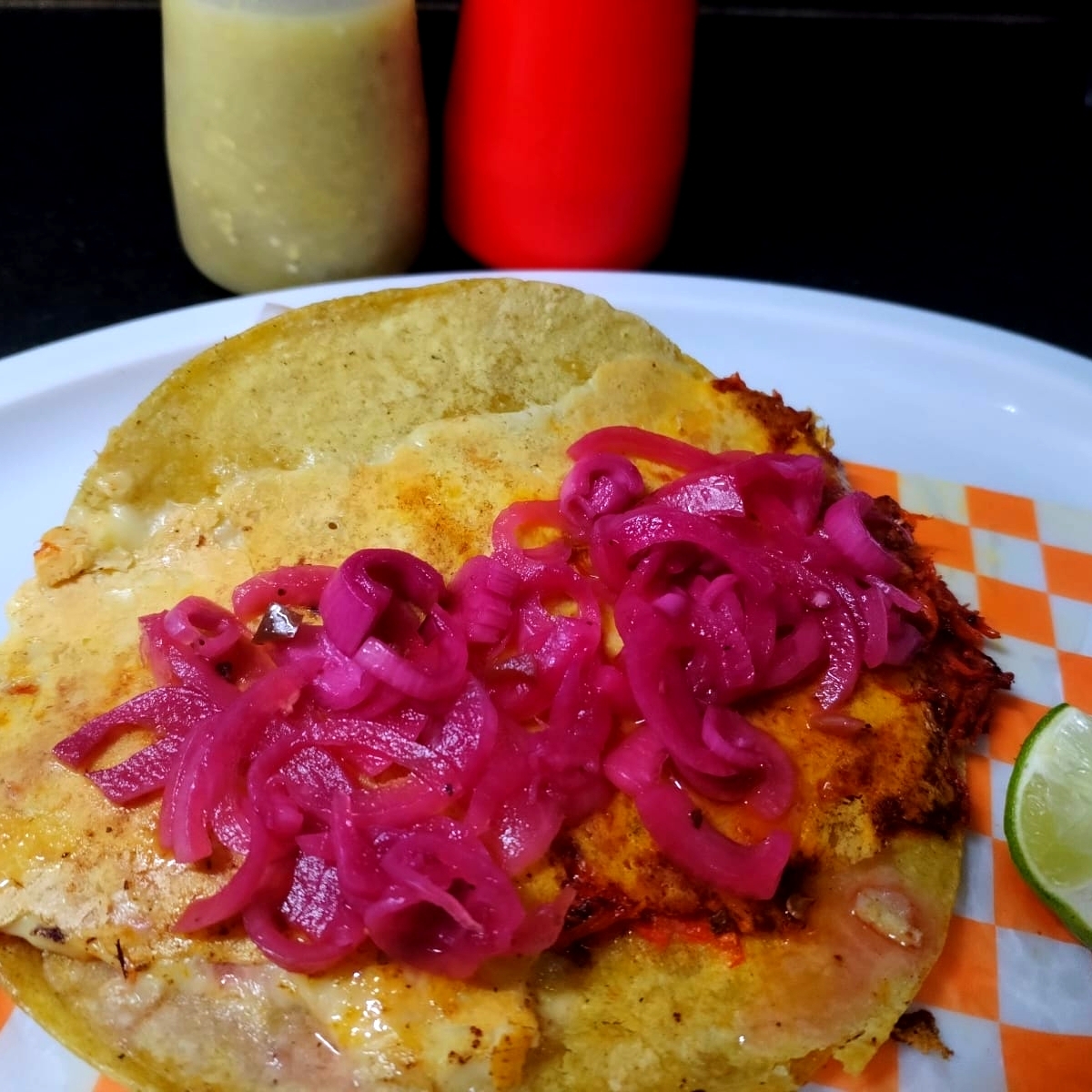 DOBLE TORTILLA DE MAIZ,COCHINITA PIBIL,QUESO GOUDA,CEBOLLA MORADA CON HABANERO