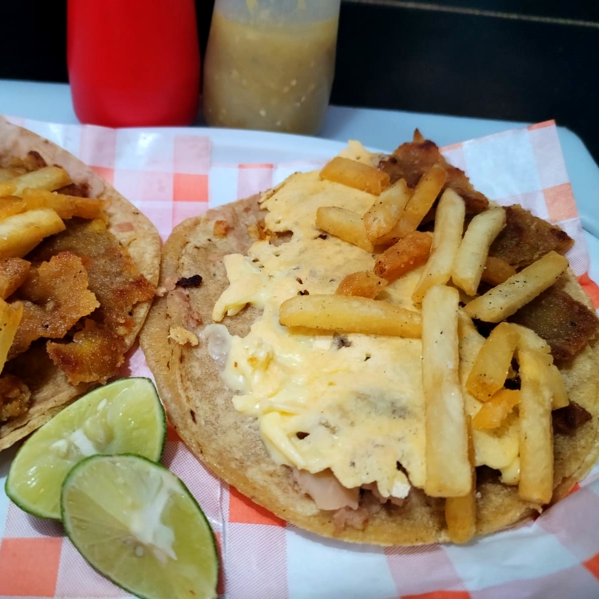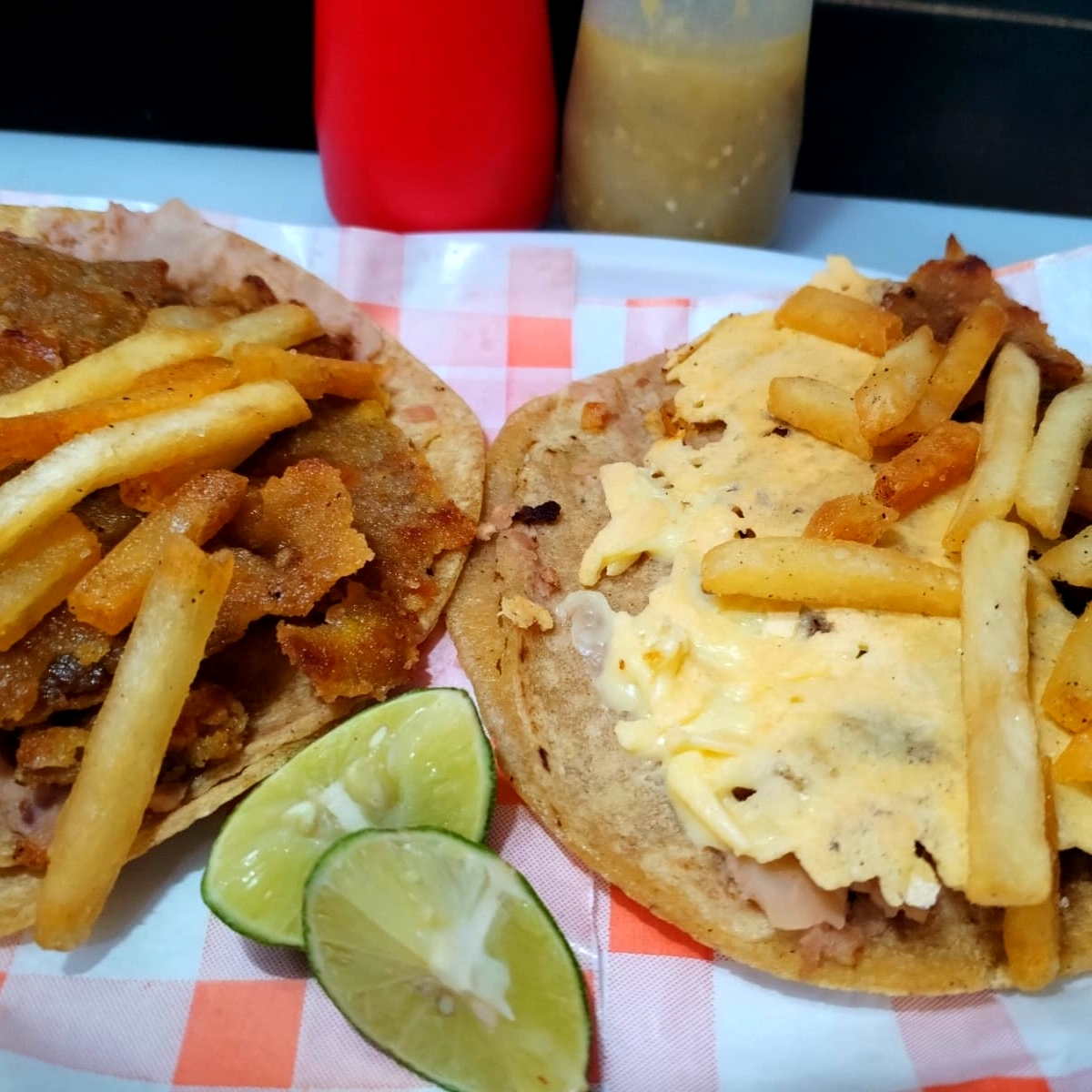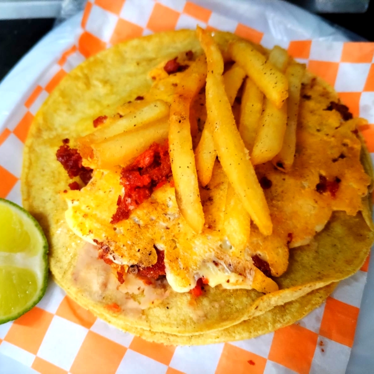 DOBLE TORTILLA DE MAIZ,FRIJOLES BAYOS REFRITOS,LONGANIZA,QUESO GOUDA PAPAS A LA FRANCESA.