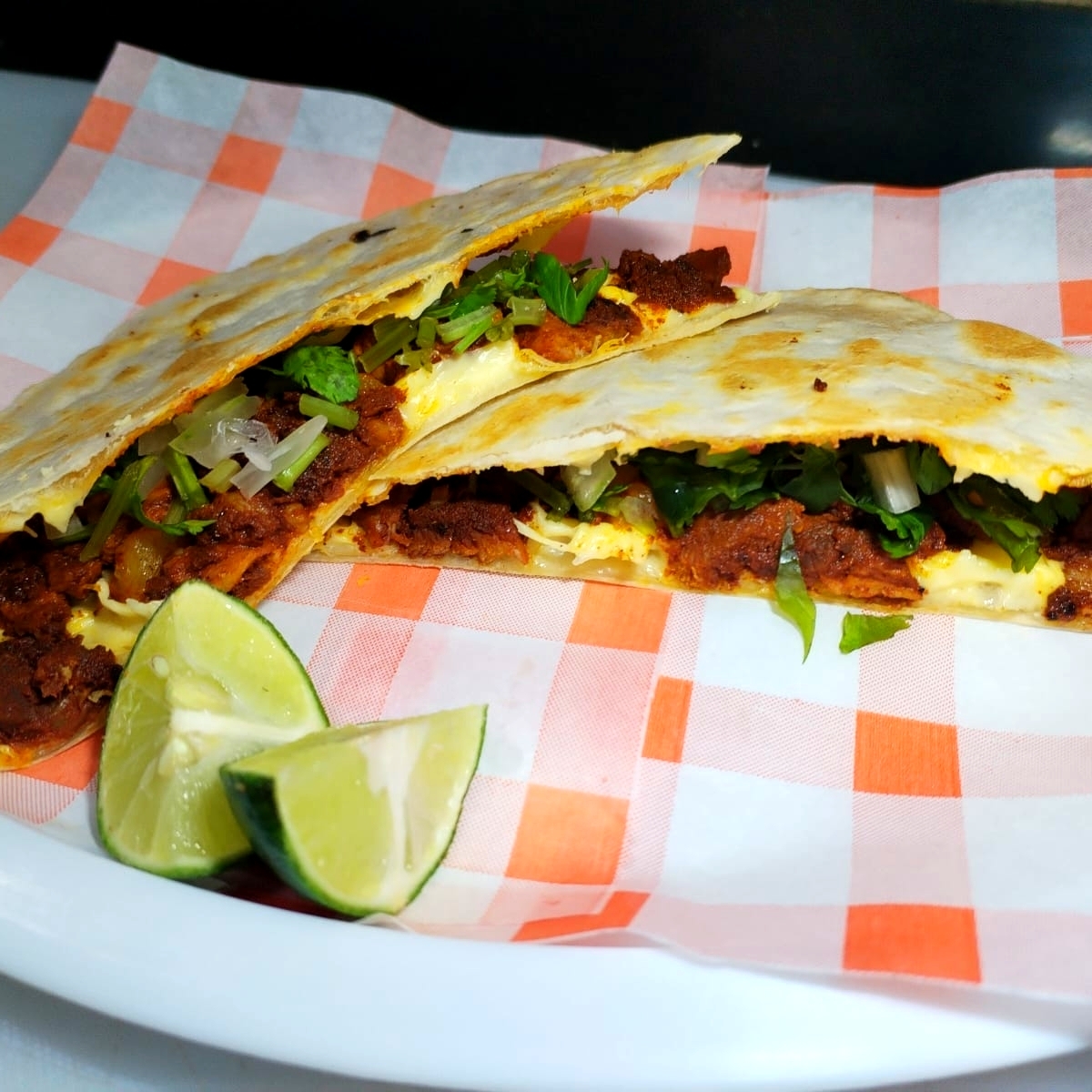 DOBLE TORTILLA DE HARINA ,CARNE AL PASTOR,QUESO GOUDA,CILANTRO Y CEBOLLA.