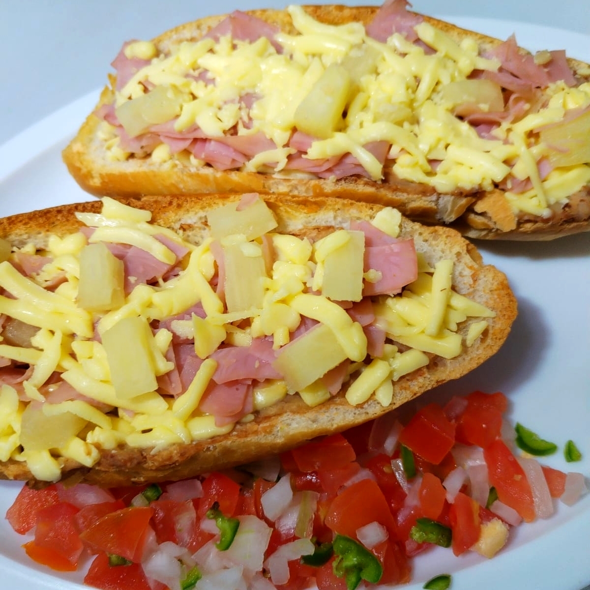 BOLILLO,FRIJOLES BAYOS REFRITOS,JAMON EN PEQUEÑOS CUADROS,PIÑA,QUESO GOUDA.