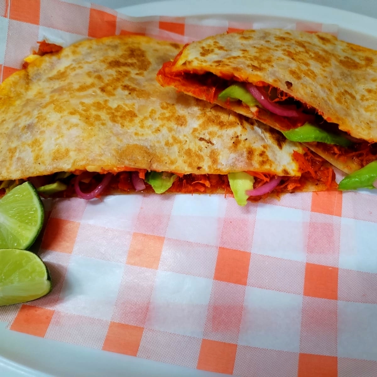 DOBLE TORTILLA DE HARINA,COCHINITA PIBIL,AGUACATE,QUESO GOUDA Y CEBOLLA MORADA CON HABANERO