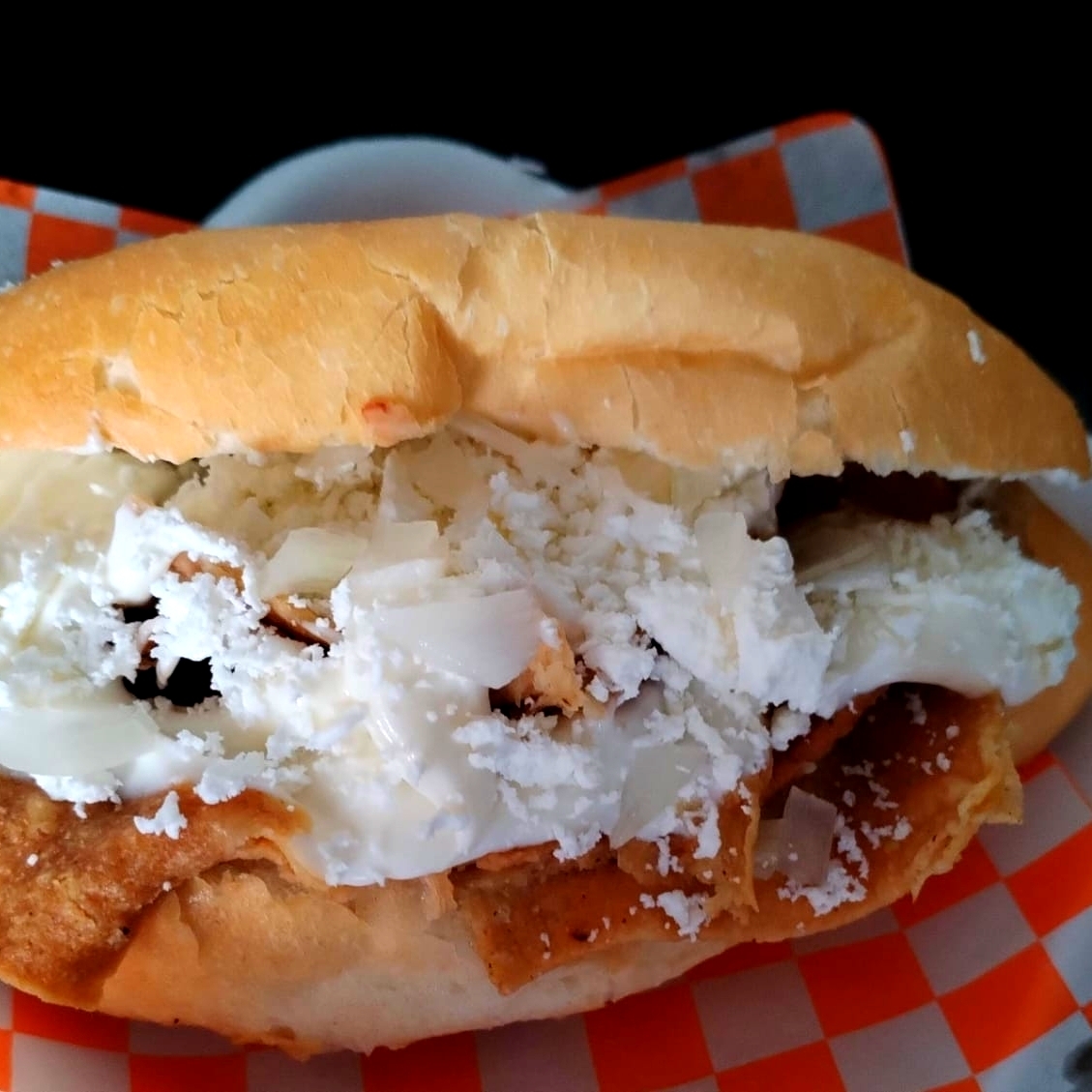 BOLILLO,FRIJOLES BAYOS REFRITOS,MIILANESA DE RES,QUESO GOUDA.