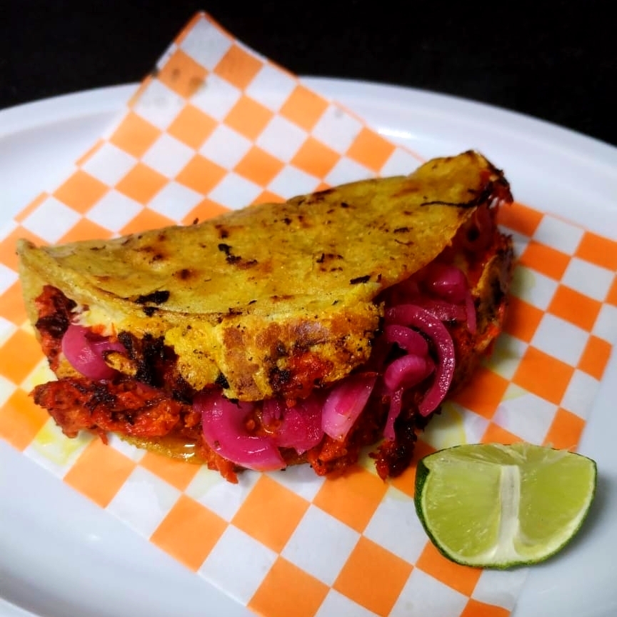 TORTILLA DE MAIZ DORADA,COCHINITA PIBIL,CEBOLLA MORADA,QUESO GOUDA