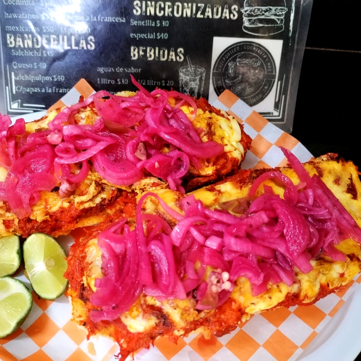 BOLILLO,FRIJOLES BAYOS REFRITOS,COCHINITA PIBIL,QUESO GOUDA ,CEBOLLITAS MORADAS CON HABANERO