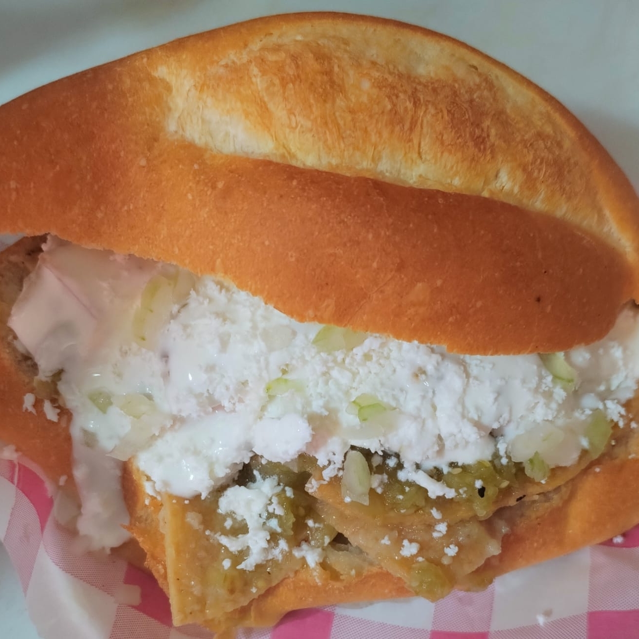 BOLILLO ,FRIJOLES,TOTOPOS BAÑADOS EN SALSA VERDE,CREMA,QUESO DOBLE CREMA Y CEBOLLA BLANCA.